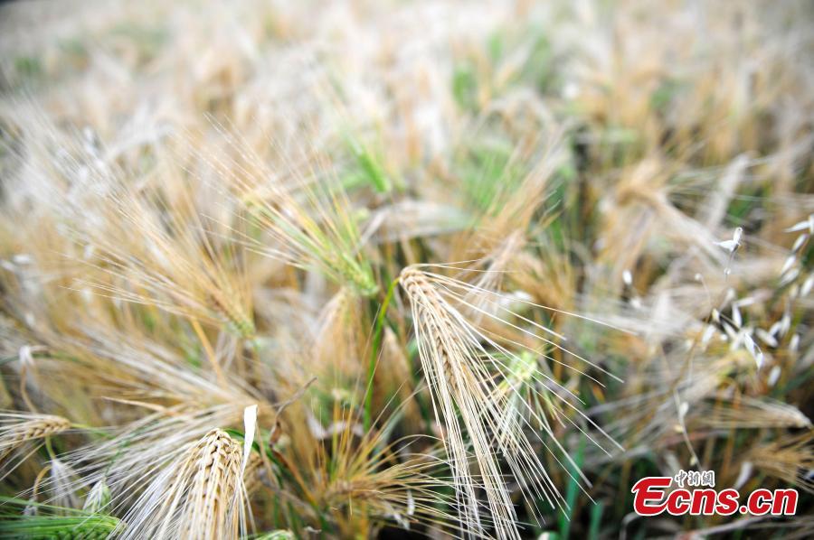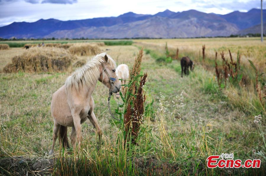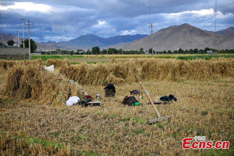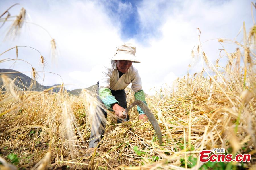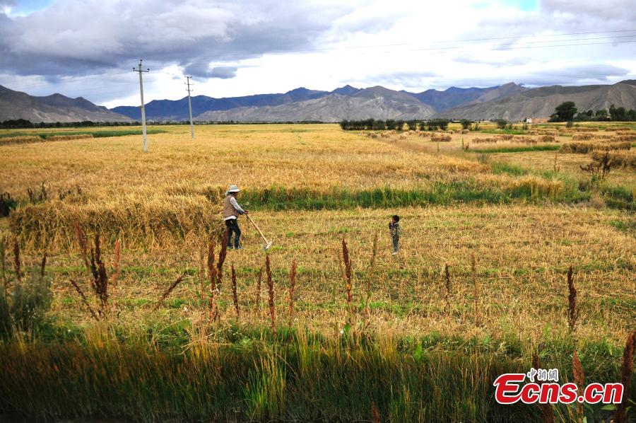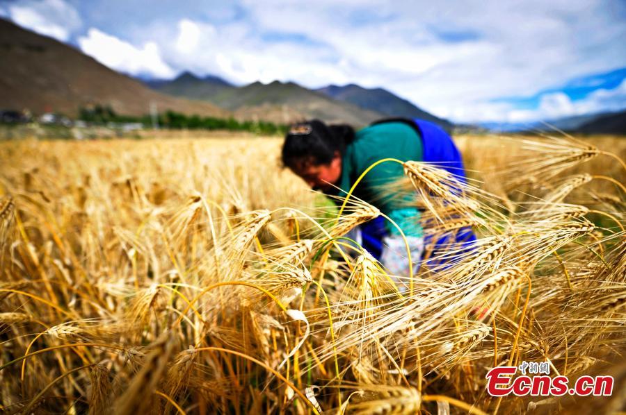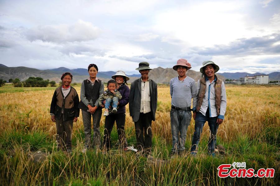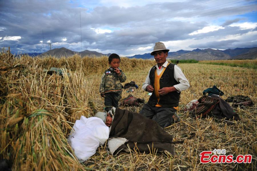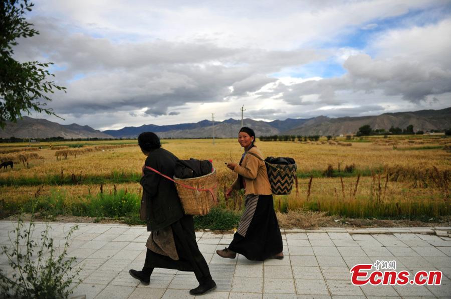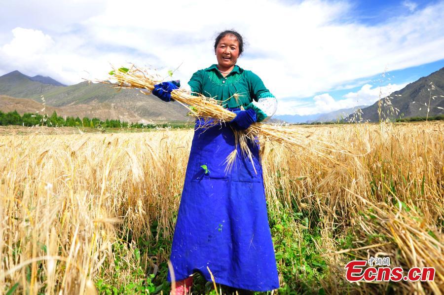 A smiling farmer carries a bunch of hulless barley in a field in Doilungdêgên county, Lhasa of Tibet autonomous region on September 14, 2014, a day of harvesting. Tibet reached its harvest season to reap hulless barley and other crops. [Photo: China News Service / Tang Chaoyang]
