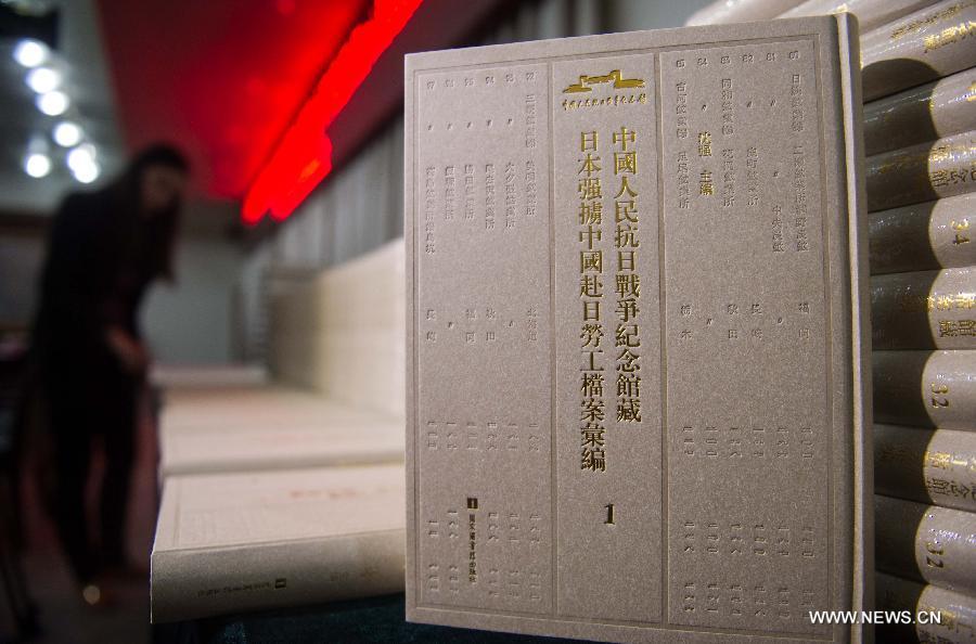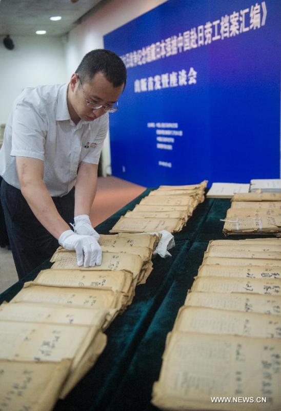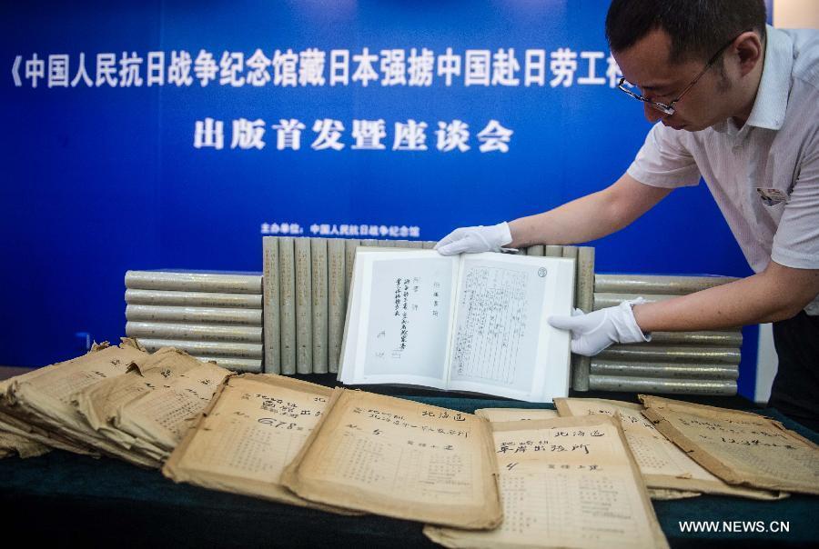 A staff member places original archives of Chinese laborers forced to Japan on a table during a seminar on issuing the archives compilation at the Museum of the War of the Chinese People's Resistance Against Japanese Aggression, in Beijing, China, Sept 18, 2014. From 1943 to 1945, some 40,000 Chinese were captured and taken by the invaders to Japan, forcing them to work in mines and construction sites. A total of 6,830 died due to the ruthless exploitation, according to the data from Japan. (Xinhua/Luo Xiaoguang)