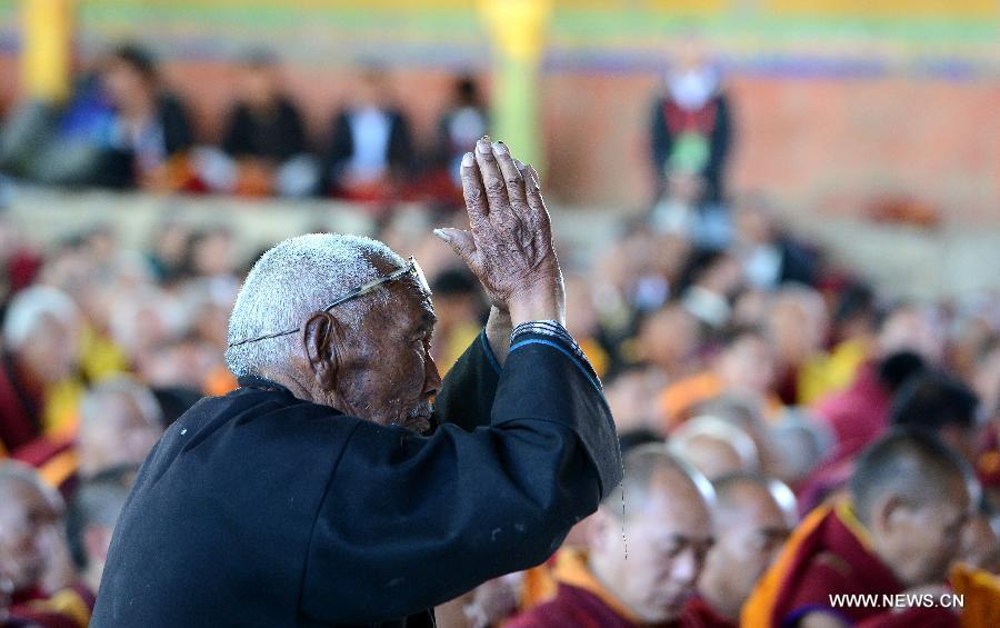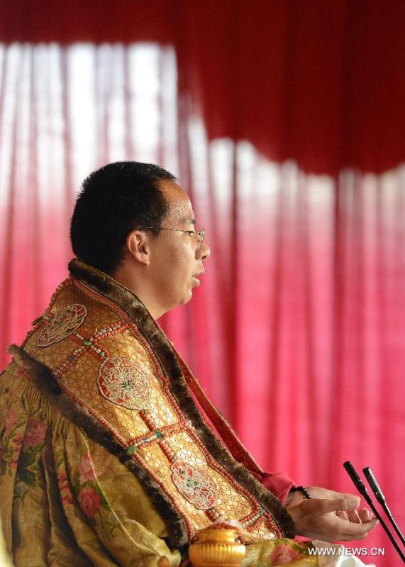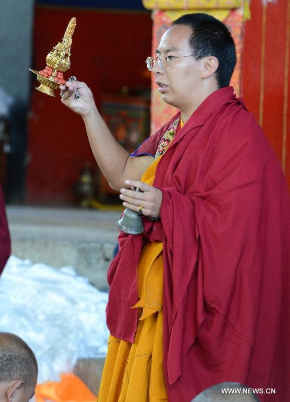 Monks attend a religious service held by the 11th Panchen Lama, Bainqen Erdini Qoigyijabu, at the Tashilhunpo Monastery in Xigaze, southwest China's Tibet Autonomous Region, Sept 18, 2014. (Xinhua/Chogo)