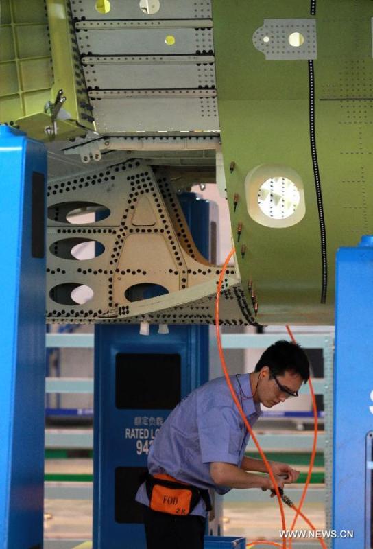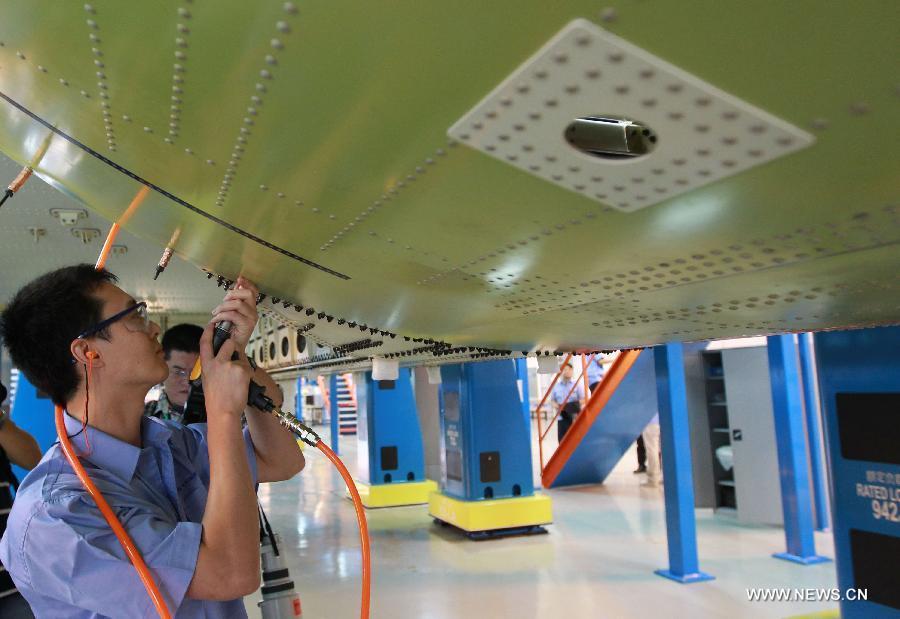 Technicians install rivets on fuselage of C919 airliner in the assembly base of the Commercial Aircraft Corp. of China (COMAC) in Shanghai, east China, Sept. 19, 2014. China's first C919 airliner started structural assembly on Friday here. The first C919 airliner is expected to make a maiden flight by the end of 2015. (Xinhua/Ding Ting)