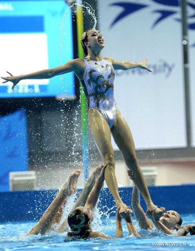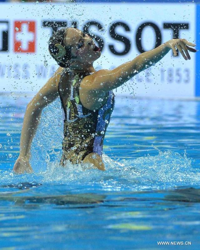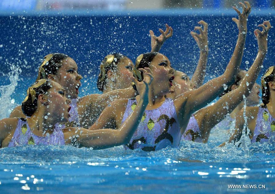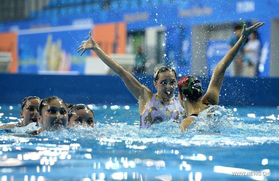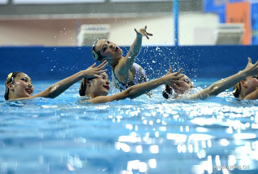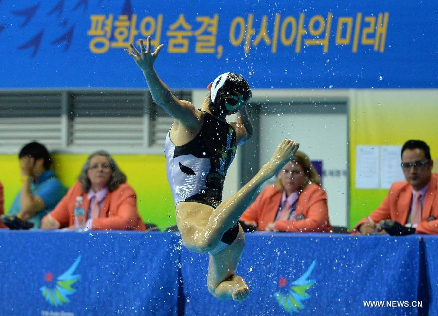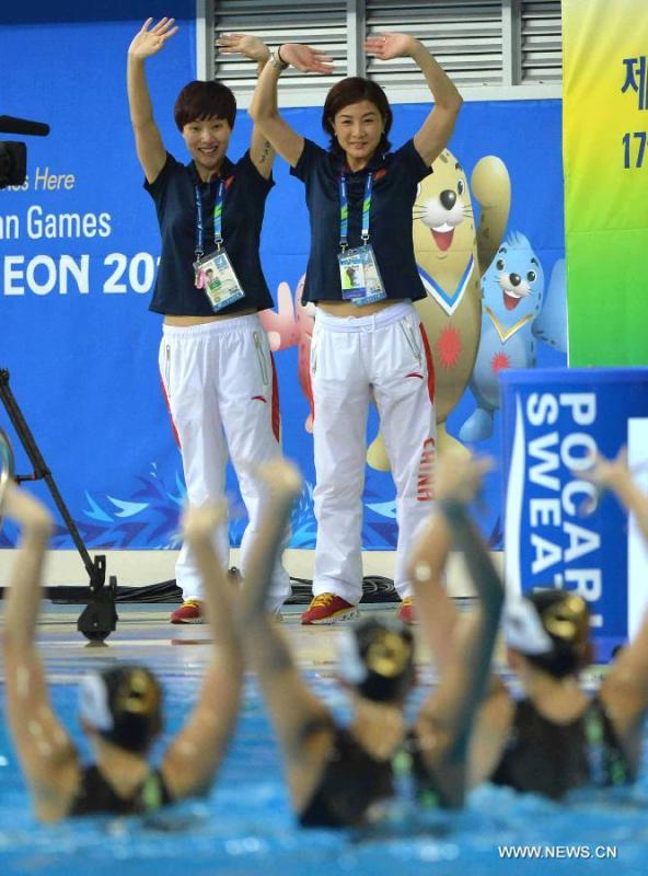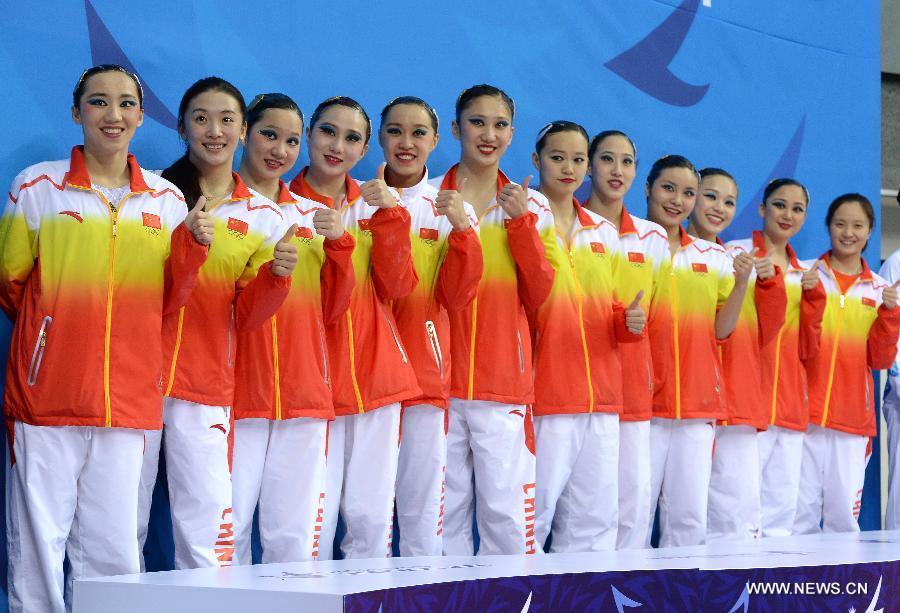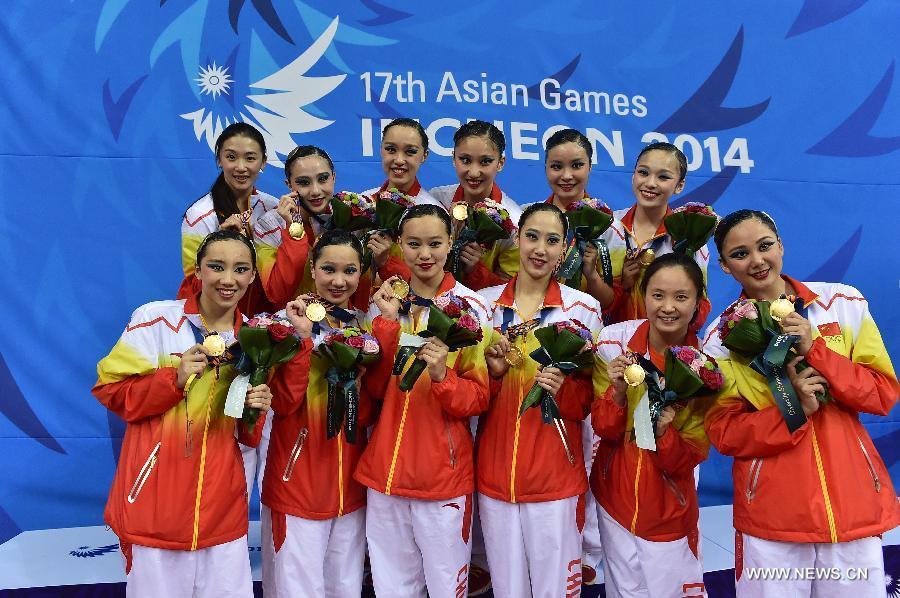Swimmers of China pose for group photo during the awarding ceremony of the free combination contest of synchronised swimming at the 17th Asian Games in Incheon, South Korea, Sept. 23, 2014. China won the gold medal with 94.9667 points. (Xinhua/Wang Peng)