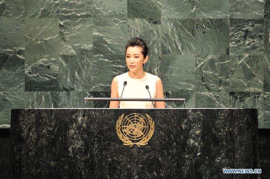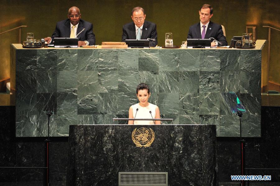 Li Bingbing, actress and UN Environment Programme Goodwill Ambassador, speaks during the opening ceremony of the Climate Summit at the UN headquarters in New York, on Sept 23, 2014. The one-day summit, convened by UN Secretary-General Ban Ki-moon, is expected to galvanize global action on climate change. (Xinhua/Niu Xiaolei)