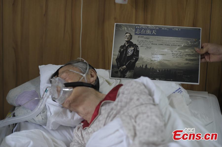 Long Qiming, a former senior Flying Tigers pilot is critically ill in a hospital in Chongqing municipality on Tuesday, September 23, 2014. The 91-year-old pilot was hospitalized in July with a serious lung infection, according to doctors at No 1 Hospital affiliated with Chongqing University of Medical Science. Long said he wants to recover to take part in events in Beijing in 2015 marking the 70th anniversary of the War of Resistance against Japanese Aggression (1937-45). He is the only Flying Tigers pilot still alive on the Chinese mainland. [Photo/ China News Service]