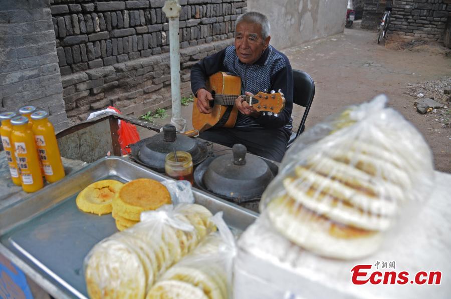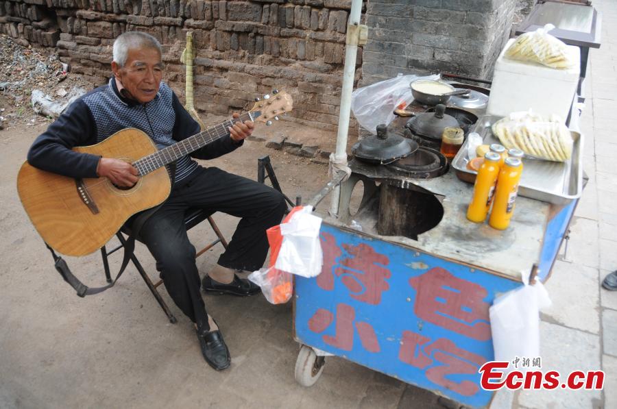Wu Siying, an 80-year-old vendor plays the guitar while waiting for consumers on a street in Pingyao, Shanxi province on Tuesday, September 23, 2014. The 80-year-old music lover has started to learn to play guitar by himself two years ago. Wu enjoys the moment of singing and playing the guitar during his wait for consumers at the food stand. Local residents said Wu’s performance was a feast for ears. [Photo: China News Service/ Wu Junjie]