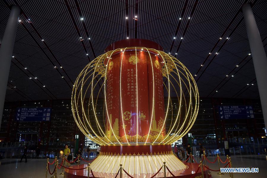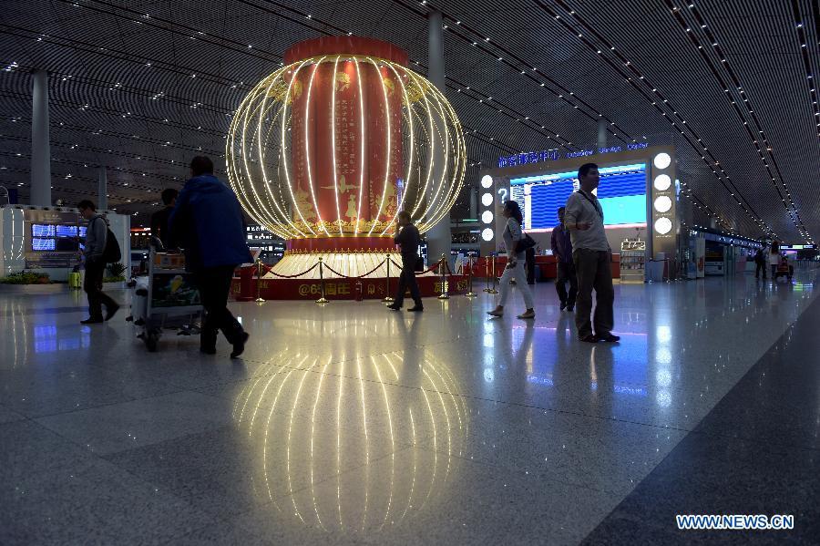 Photo taken on Sept. 23, 2014 shows a giant lantern at Capital International Airport in Beijing, capital of China. The giant lantern, decorated with elements of the number 65 and 65 plane models, was designed to celebrate the 65th anniversary of the founding of the People's Republic of China. (Xinhua/Jin Liangkuai)