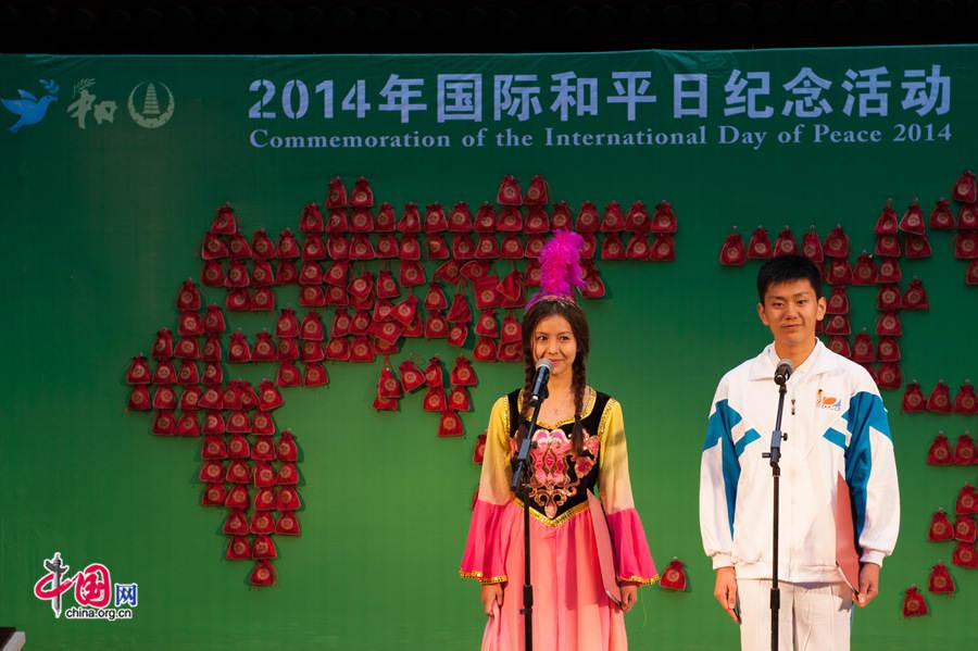 A Kazakhstani girl studying in Xi'an and a local high school student read a peace-themed poem aloud on Tuesday, Sept 23, 2014, as part of the historic Chinese city's commemoration of the International Day of Peace, which falls on Sept 21 each year. [Photo by Chen Boyuan / China.org.cn]