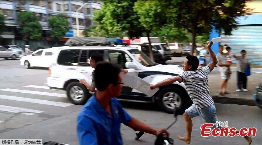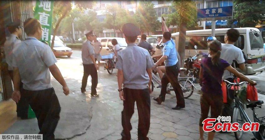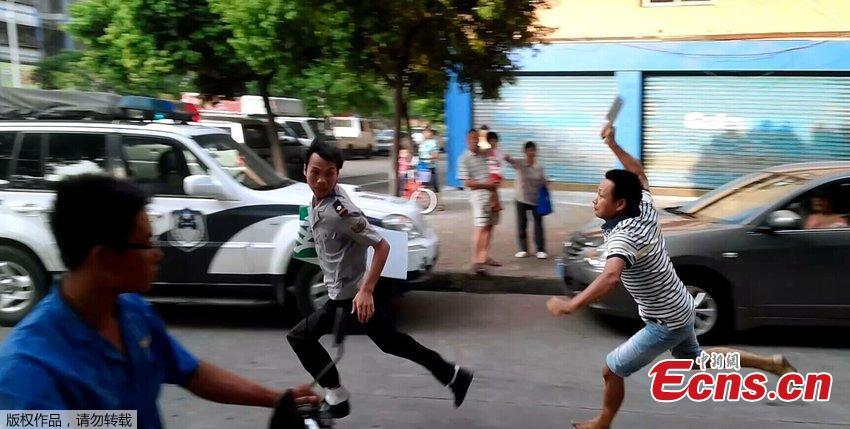 A man holding a kitchen knife runs after a Chengguan (urban management) officer in the street of Foshan, Guangdong province on Sept 23, 2014. The man, a store-owner, refused to remove advertisement signs and resorted to violence, reports said. Local police fired a warning shot and stopped him. The man was then taken to a police station. [Photo: CFP]