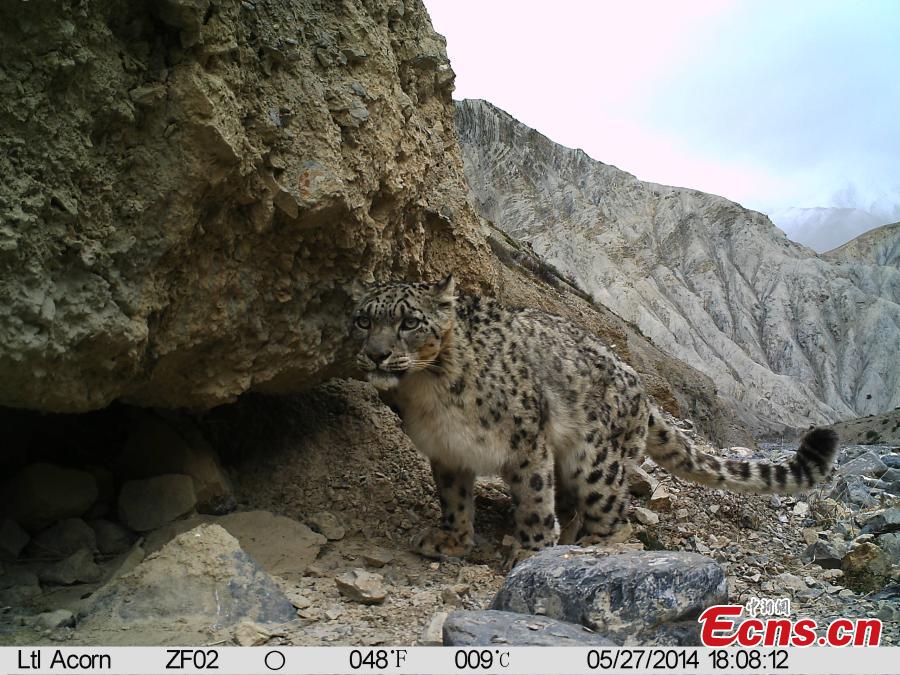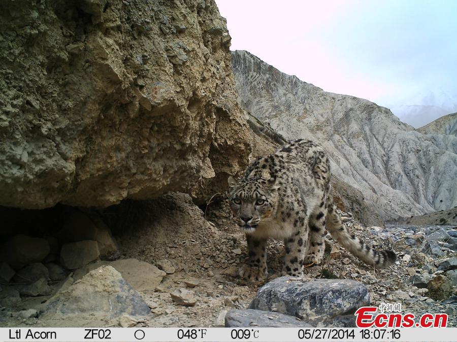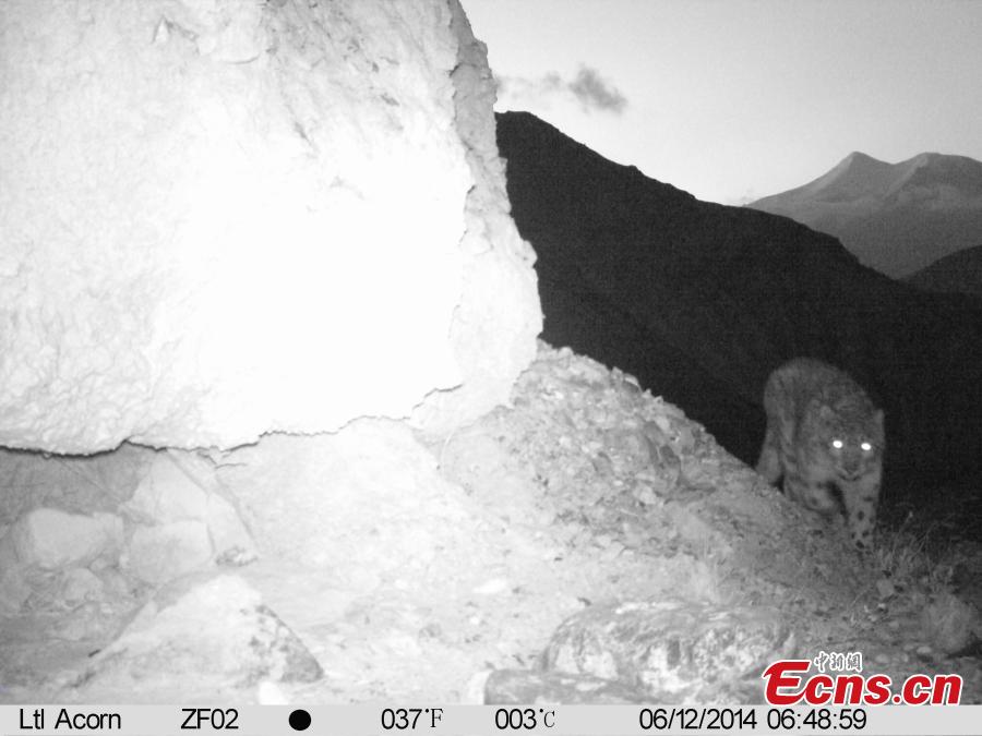 A wild snow leopard was photographed in Qomolangma National Nature Reserve in West China's Tibet Autonomous Region, according to a snow leopard conservation center in Tibet on Wednesday, September 24, 2014. It is the first time that a snow leopard, the first-grade state protected animal, is captured in the Tibetan nature reserve area. [Photo/ China News Service]