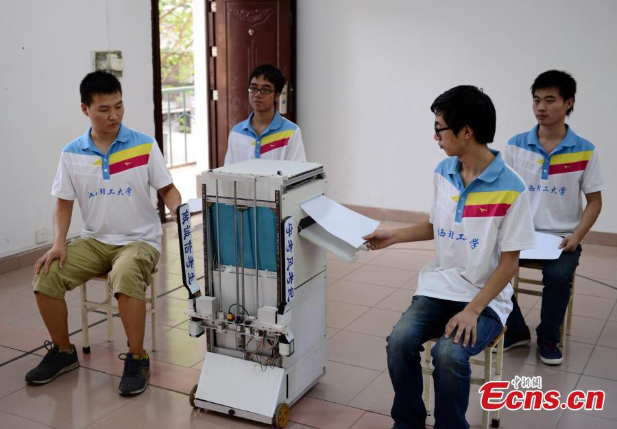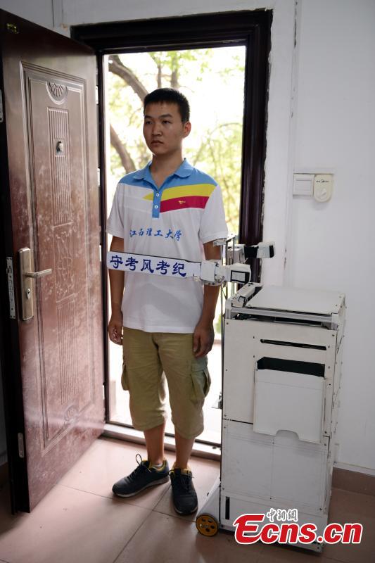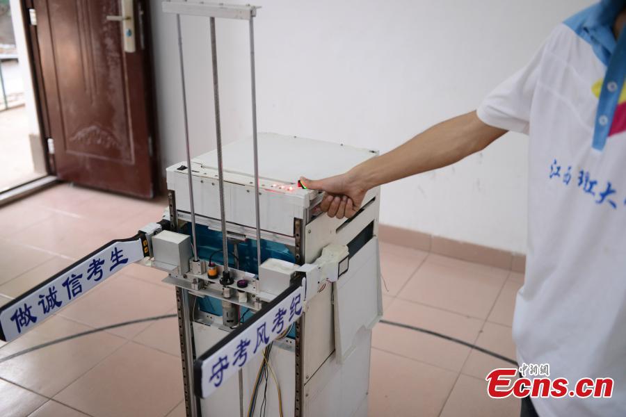 A robotic exam invigilator distributes papers to students in a demonstration. Invented by four students from the Jiangxi University of Science and Technology, the multifunctional robot can replace human invigilators to distribute papers, verify candidates’ identity, and prevent cheating during exams. [Photo/ Luo Shuaixiang]