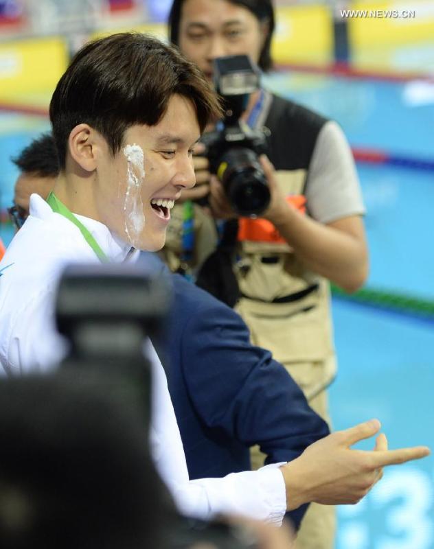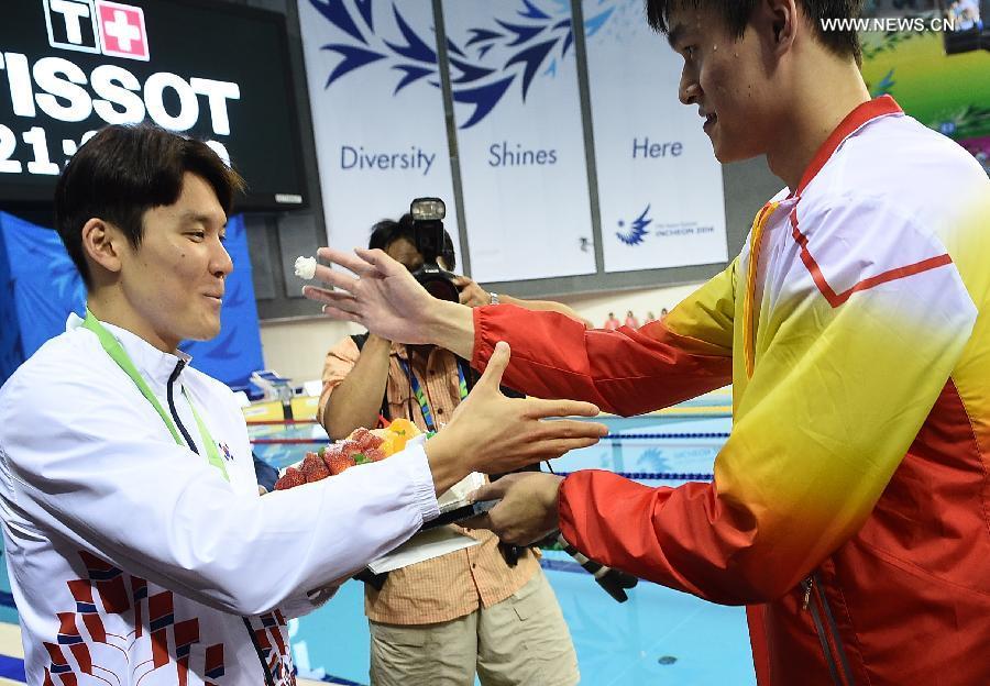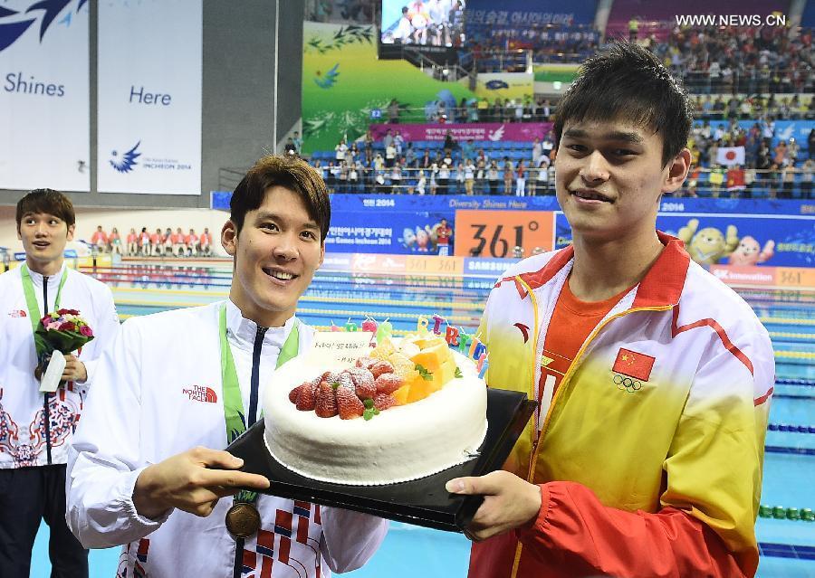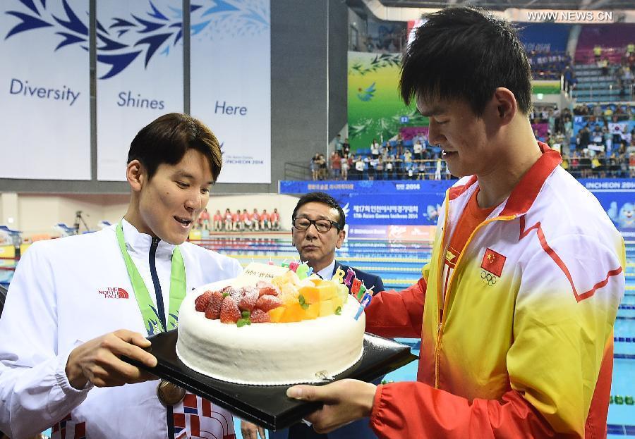 Sun Yang (R) of China presents a birthday cake to Park Taehwan of South Korea after all swimming contests at the 17th Asian Games in Incheon, South Korea, Sept. 26, 2014, one day before Park Taehwan's 25-year-old birthday. (Xinhua/Wang Peng)
