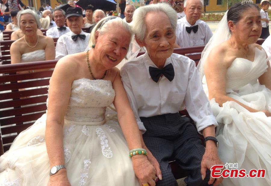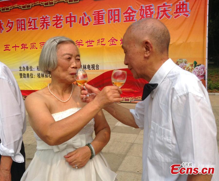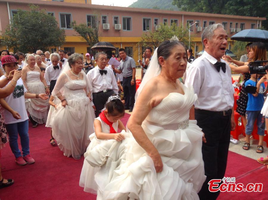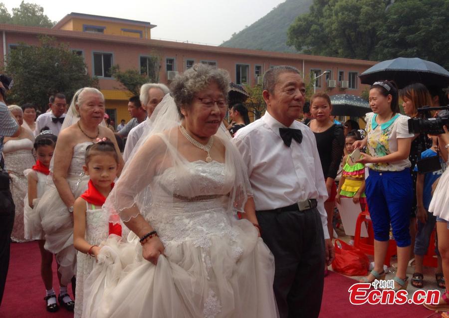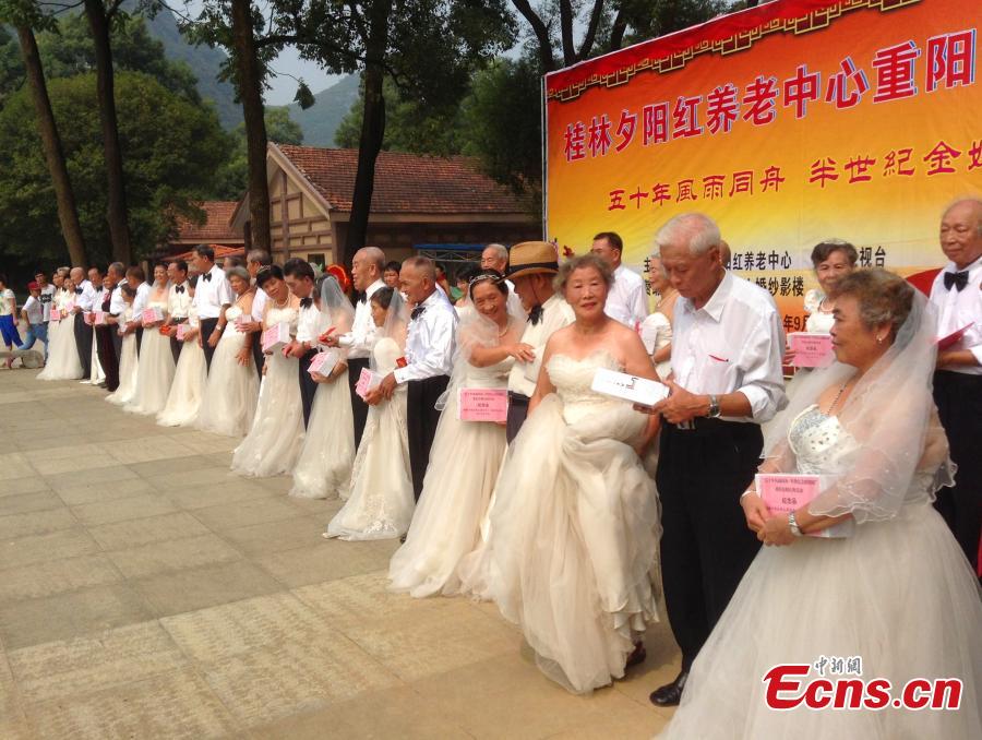 A total of 29 old couples join a ceremony held to mark their 50th wedding anniversary in a nursing home in Guilin, South China's Guangxi Zhuang Autonomous Region on Saturday, September 27, 2014. The event was held to mark the traditional Double Ninth Festival, or the "Old Men Festival". [Photo: China News Service/ Li Guo]