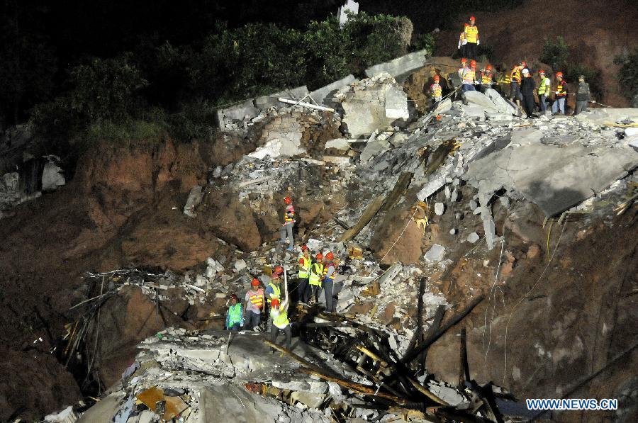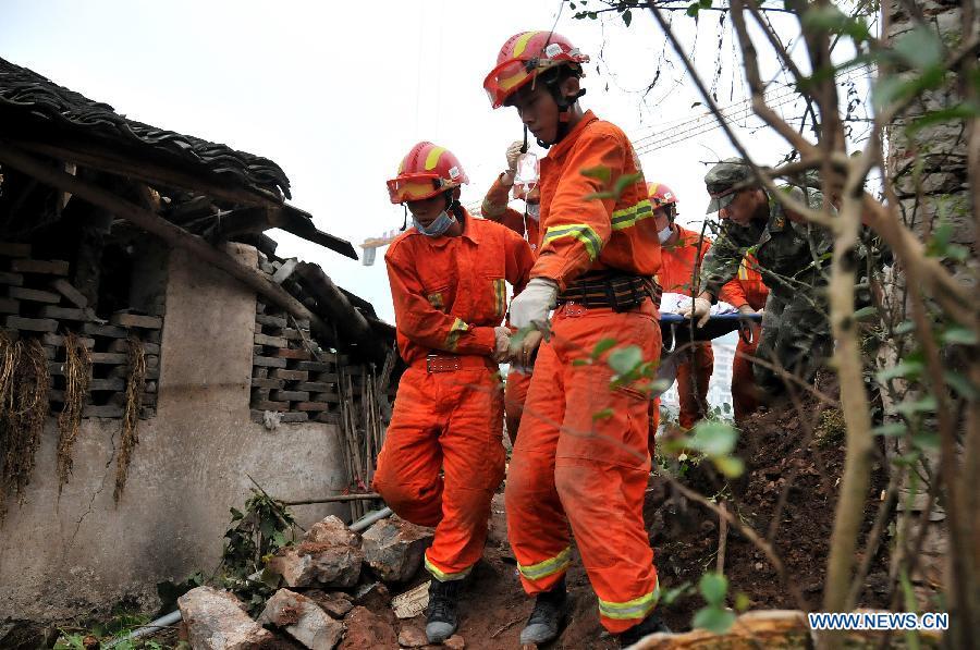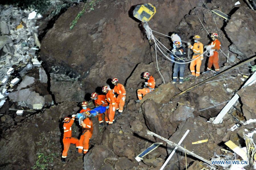 Rescuers transfer a survivor from a landslide site at the Baihejing community in Zhushan Town of Xuan'en County, central China's Hubei province, Sept 27, 2014. A landslide struck four houses in Zhushan Town early Saturday, leaving seven people dead. (Xinhua)