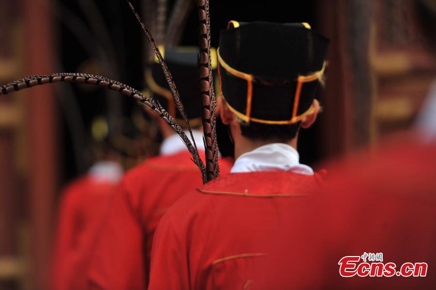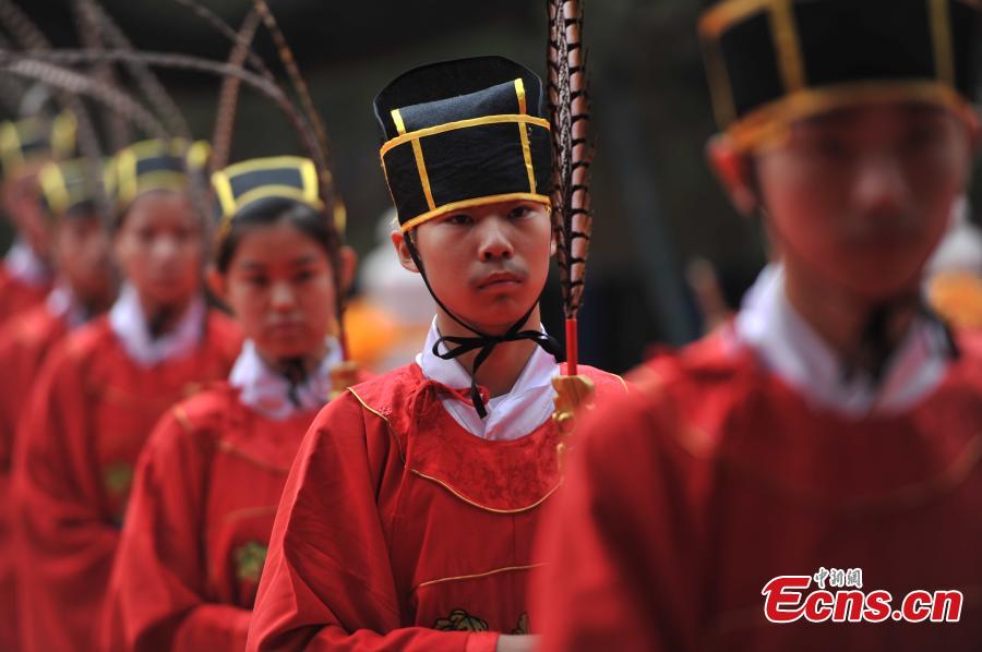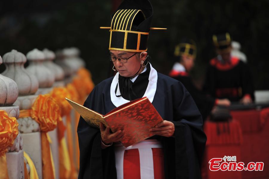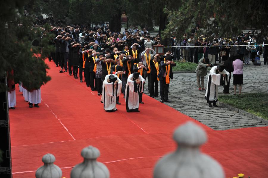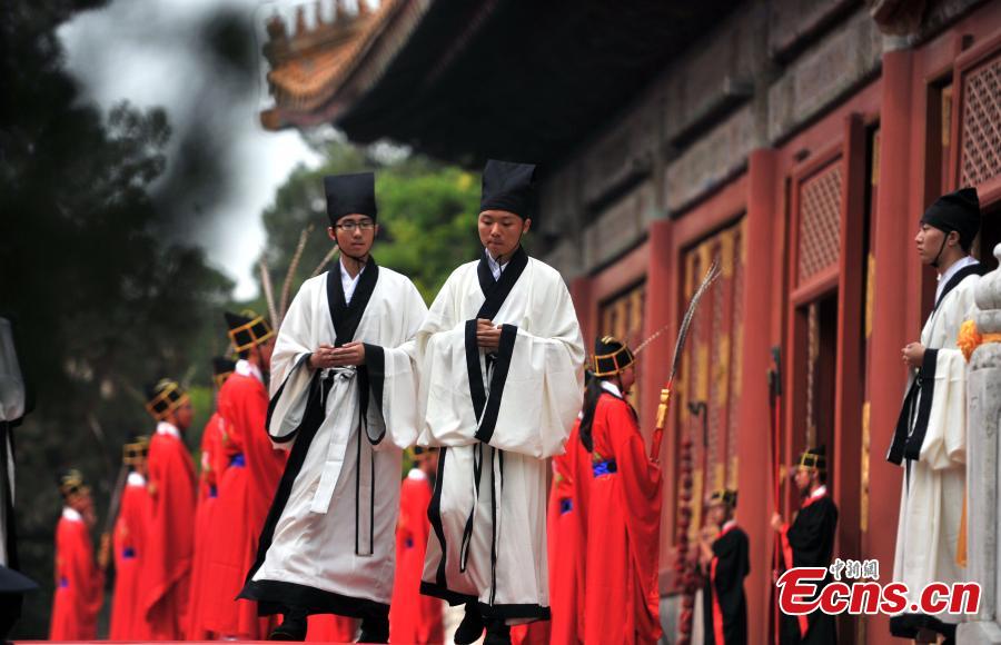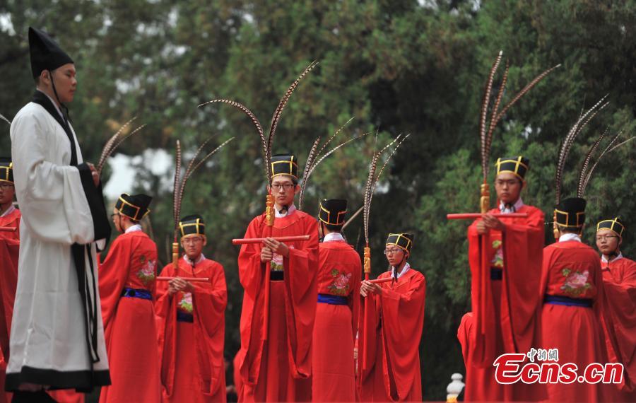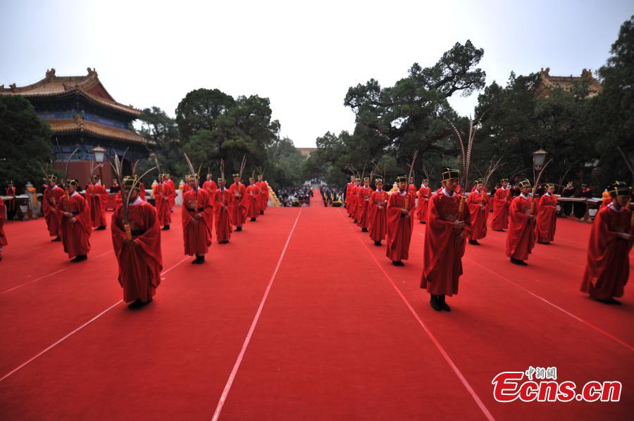 A grand ceremony in commemoration of the 2,565th anniversary of Confucius' birth is held in Guozijian, the former highest institute of learning in China's traditional educational system in Beijing on Sunday, September 28, 2014. [Photo: Chinanews.com/ Jin Shuo]