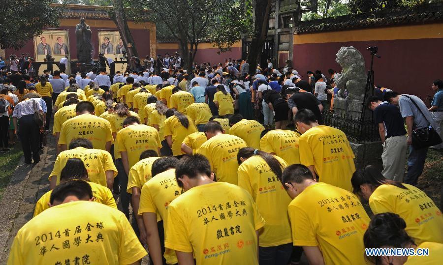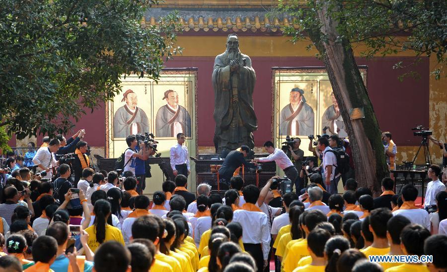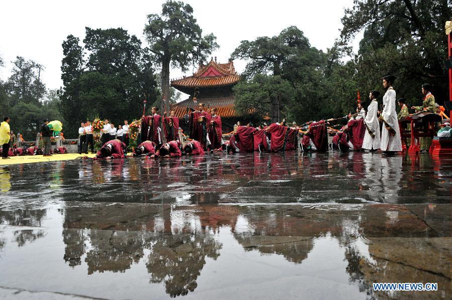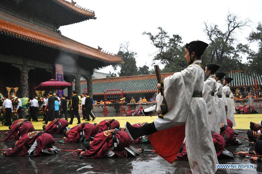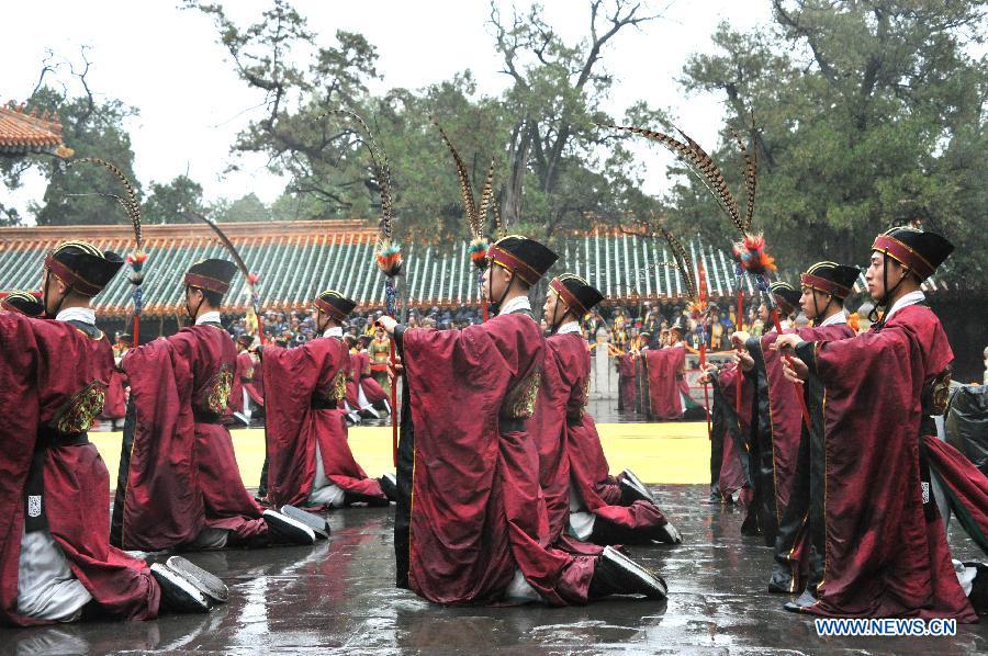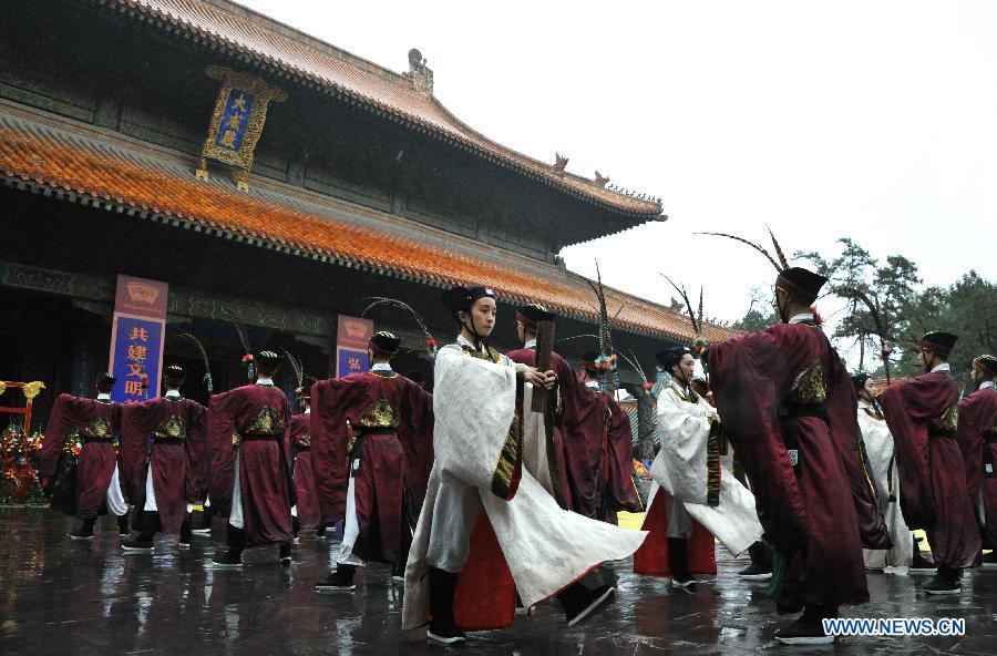 A memorial ceremony to mark the 2,565th anniversary of Confucius' birth is held at the Confucius Temple in Qufu, east China's Shandong province, Sept 28, 2014. (Xinhua/Xu Suhui)