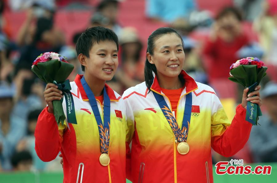 China's Ma Yuanyuan (R) and Xia Xinyi pose for photos after they win the beach volleyball women's final at the Asian Games in Incheon, South Korea on Sunday, September 28, 2014. (Photo: China News Service/Tang Yanjun)
