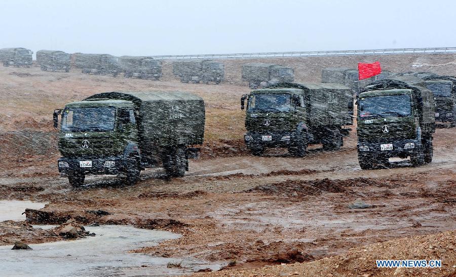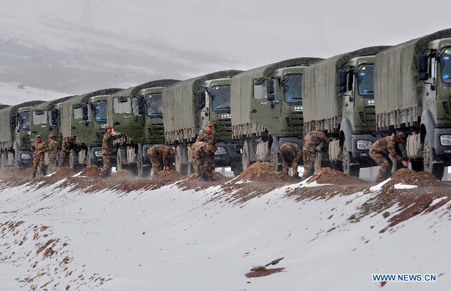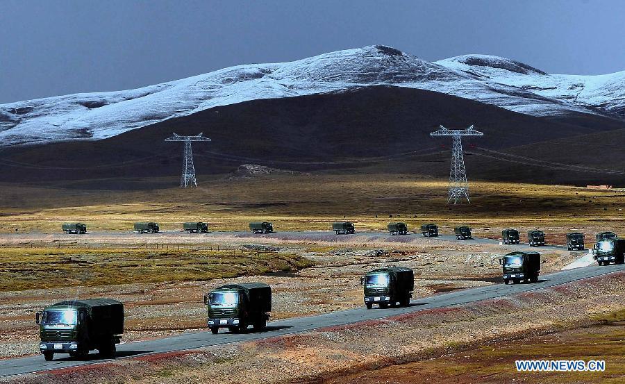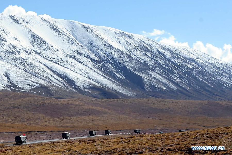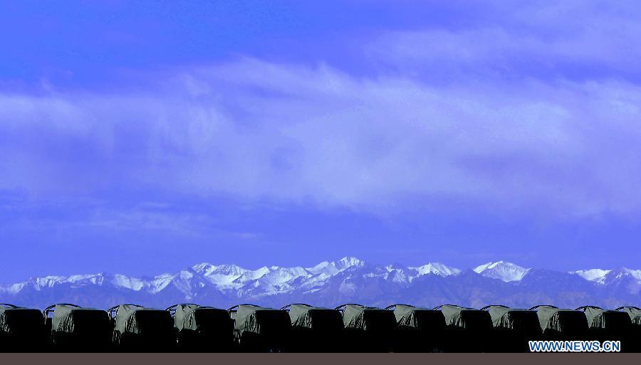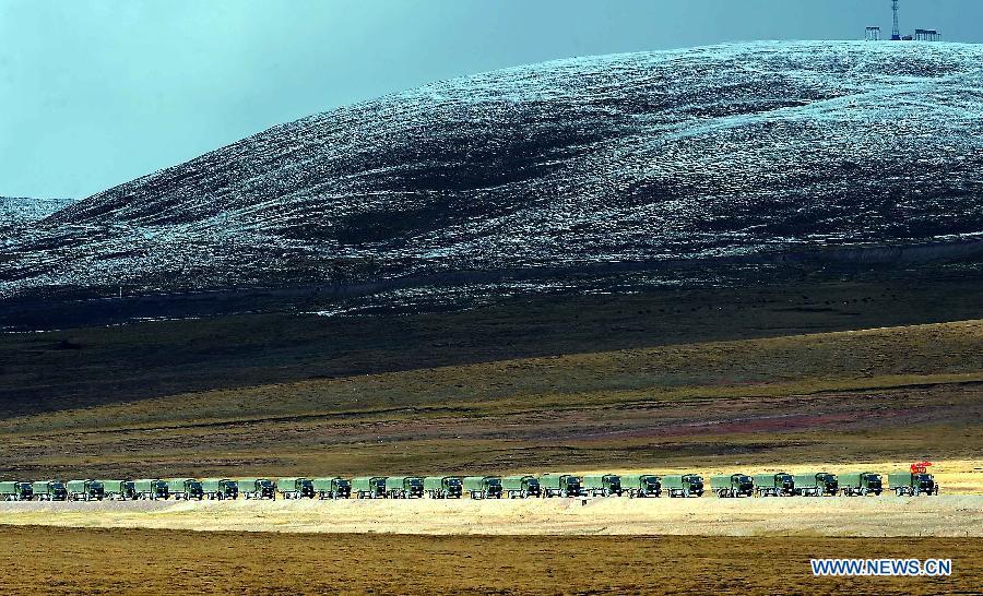 Trucks park for being loaded with cargoes at a troop's warehouse of an army service station on the Qinghai-Tibet Highway, southwest China's Tibet Autonomous Region, Sept 25, 2014. The transportation regiments of the Qinghai-Tibet Corps of the Chinese People's Liberation Army (PLA) have been undertaking cargo transportation for PLA troops in Tibet region since 1954. For 60 years, they conveyed more than 800 metric tons of materials, accomplishing about 80 percent of troop transportation task in the Qinghai-Tibet Plateau. (Xinhua/Wang Song)