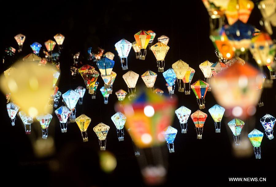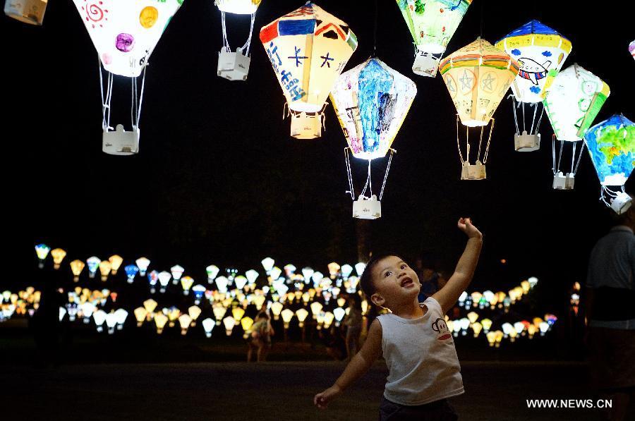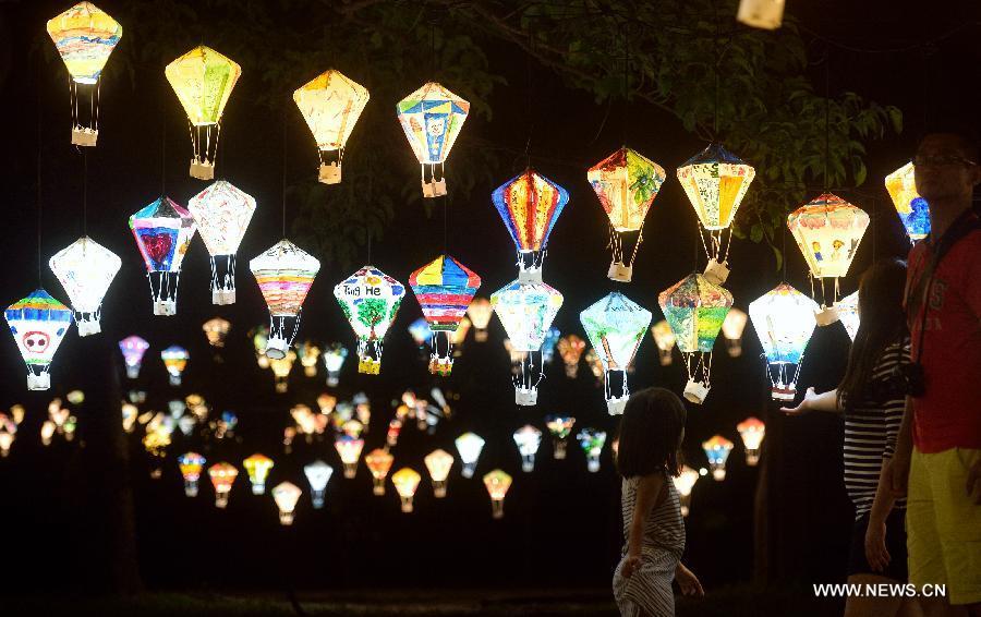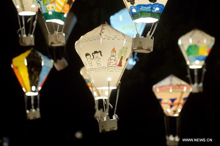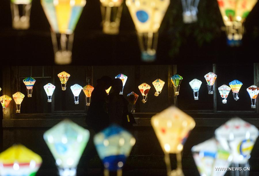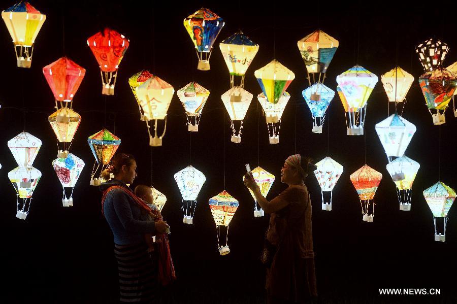 Girls view colorful lanterns at Tiehua Music Village in Taitung, southeast China's Taiwan, late Sept. 28, 2014. Artists and locals made and painted some 3,000 hot-air-balloon-shaped lanterns this summer to decorate the nearby meadow of the village, echoing the annual balloon fiesta of the city. (Xinhua/Wang Qingqin)