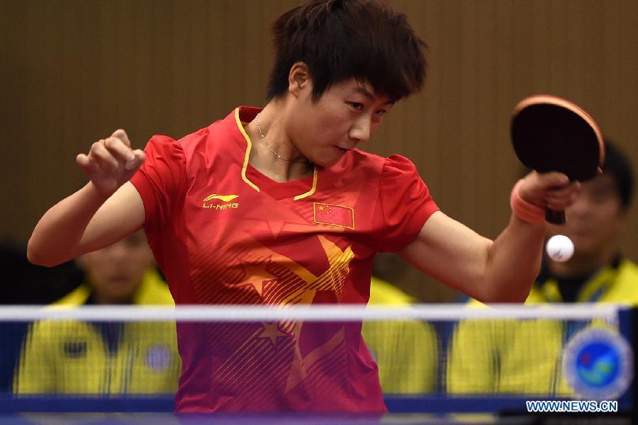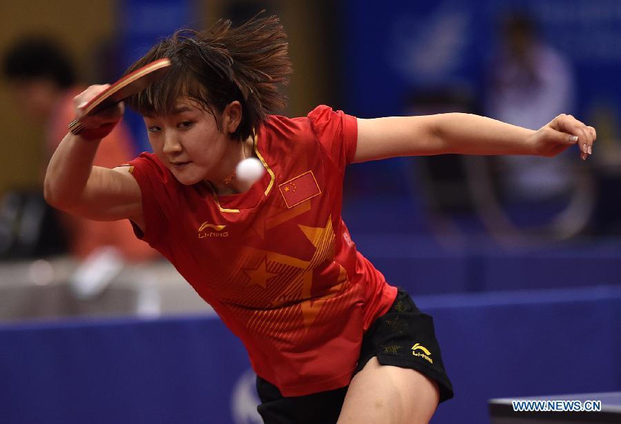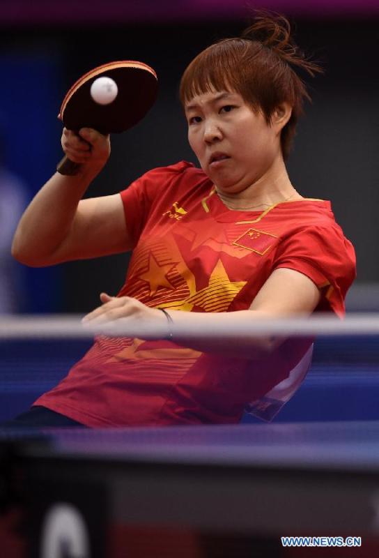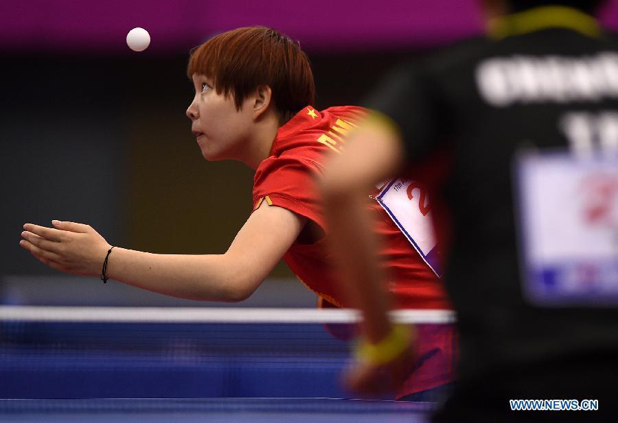 Ding Ning of China competes during the women's team quarterfinal match of table tennis against Chinese Taipei at the 17th Asian Games in Incheon, South Korea, Sept. 28, 2014. China won 3-0. (Xinhua/Han Yuqing)