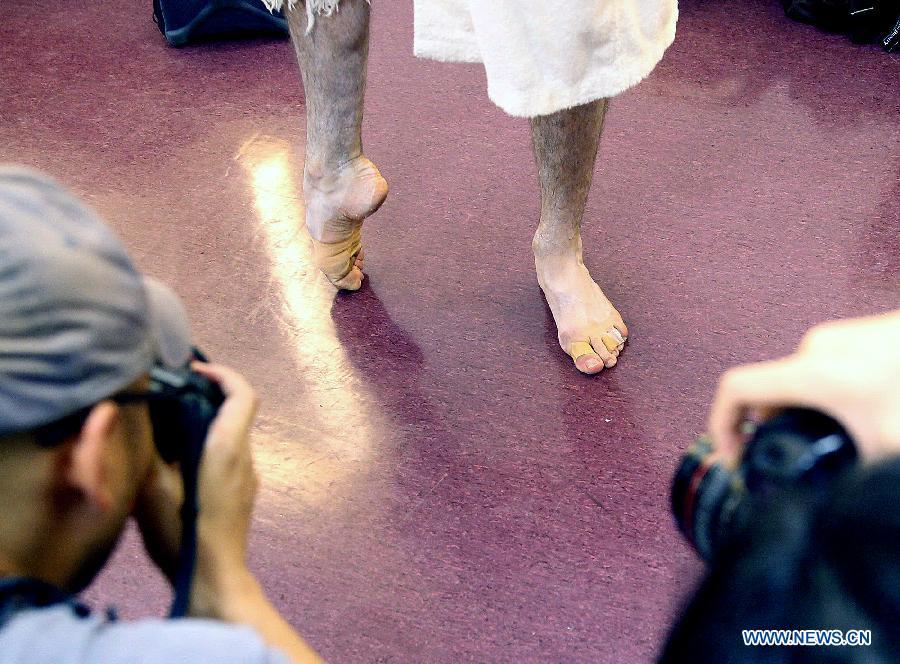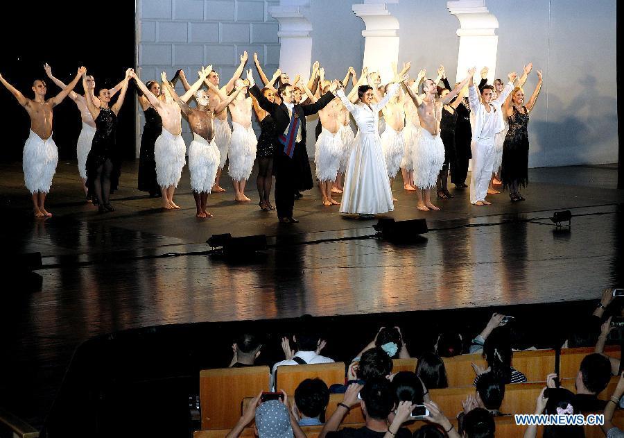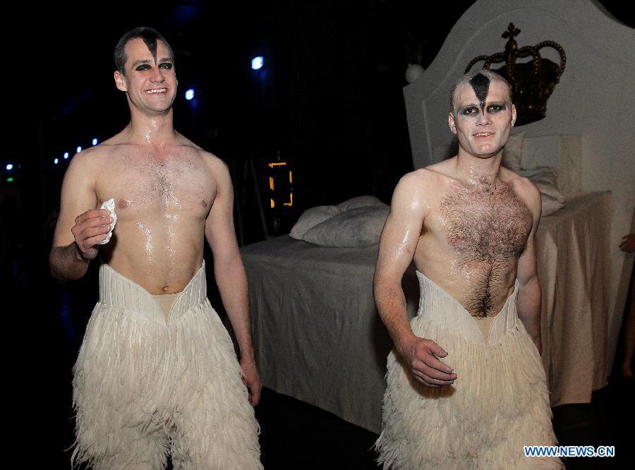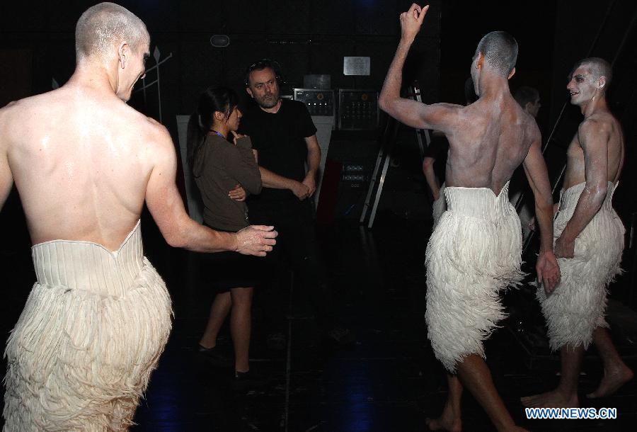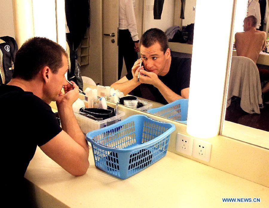 Performers prepare for the ballet "Swan Lake" in Shanghai, east China, Sept 29, 2014. The famous ballet "Swan Lake" performed by male actors was shown in Shanghai Monday. (Xinhua/Chen Fei)