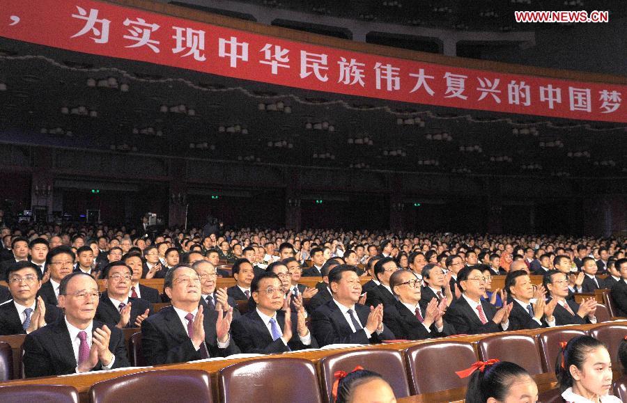 Chinese President Xi Jinping and other leaders including Li Keqiang, Zhang Dejiang, Yu Zhengsheng, Liu Yunshan, Wang Qishan and Zhang Gaoli attend a concert themed "Beautiful China and Glorious Dream" held to celebrate the 65th anniversary of the founding of the People's Republic of China at the Great Hall of the People in Beijing, capital of China, Sept 29, 2014. (Xinhua/Rao Aimin)