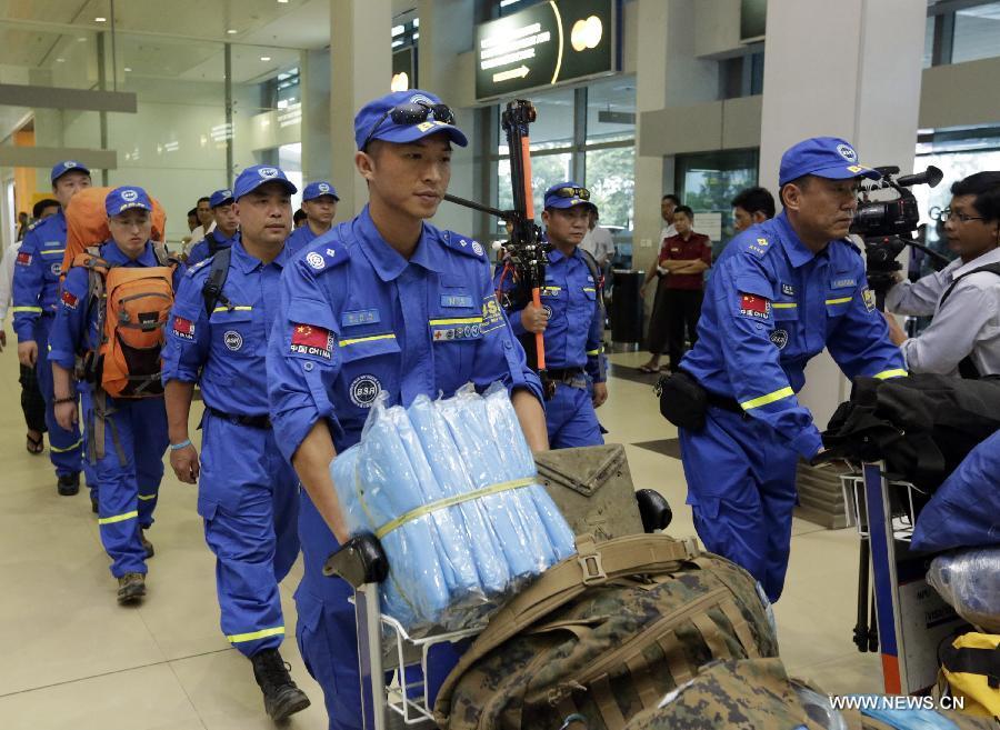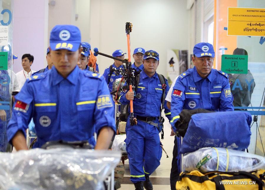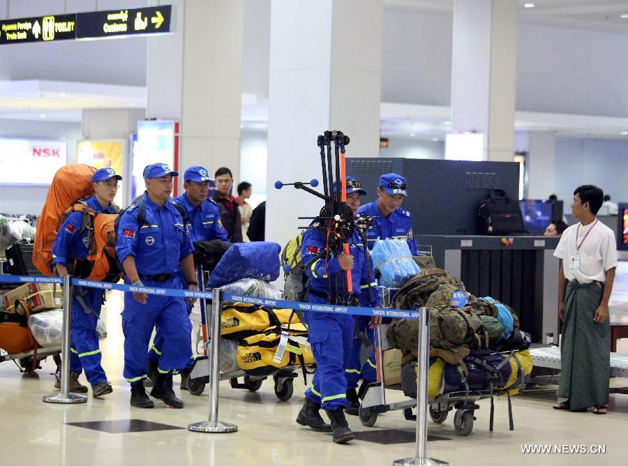 Members of the Blue Sky Rescue Team, one of China's largest civilian rescue teams, arrive at the Yangon International Airport in Yangon, Myanmar, on Sept. 29, 2014. China's Blue Sky Rescue team has sent more rescuers to Myanmar to continue search for two missing Myanmar mountaineers and one missing Thai helicopter at the request of the Myanmar side. (Xinhua/U Aung)