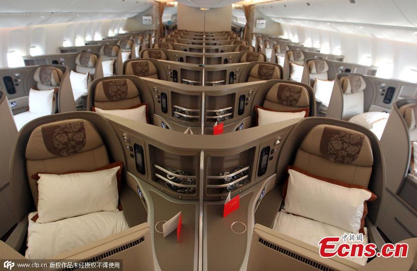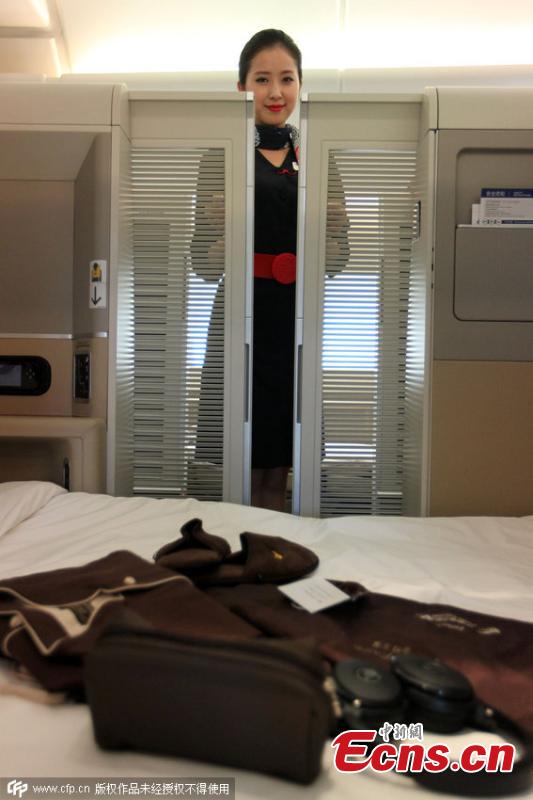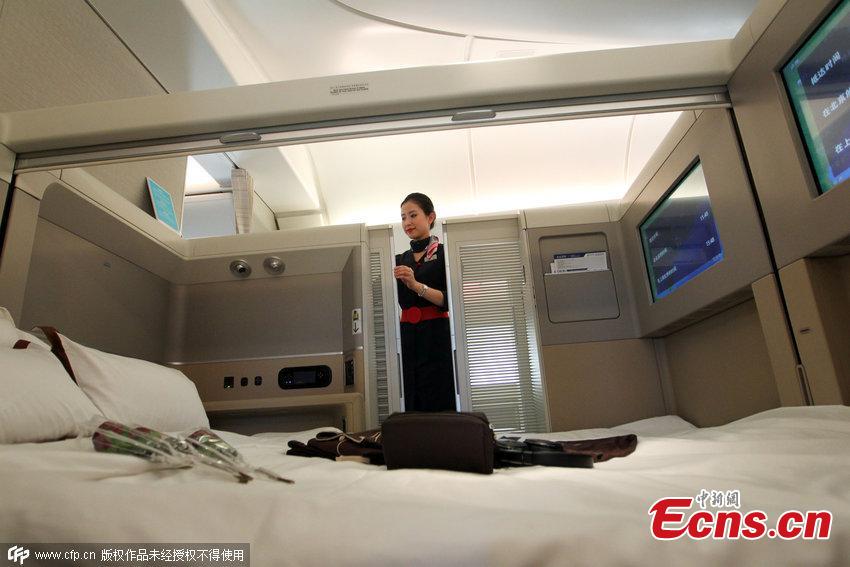 A stewardess shows an individual cabin featuring a double bed on China Eastern Airlines’ plane Boeing 777-300ER on Tuesday, September 29, 2014. [Photo/CFP]