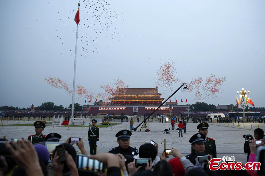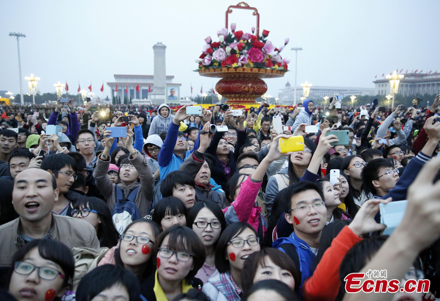 People watch the national flag raising ceremony at the Tian'anmen Square in Beijing, capital of China, October 1, 2014. Tens of thousands of people gathered at the Tian'anmen Square to watch the national flag raising ceremony at dawn on Wednesday, in celebration of the 65th anniversary of the founding of the People's Republic of China. (Photo: China News Service/Han Haidan)