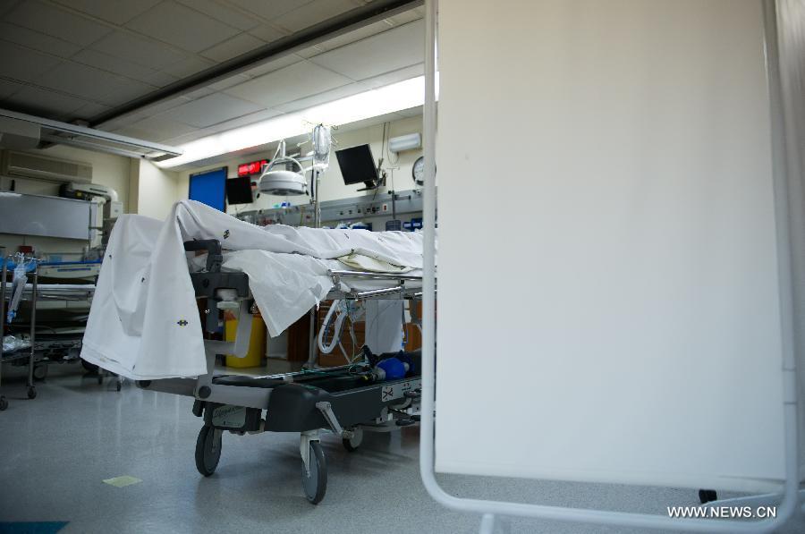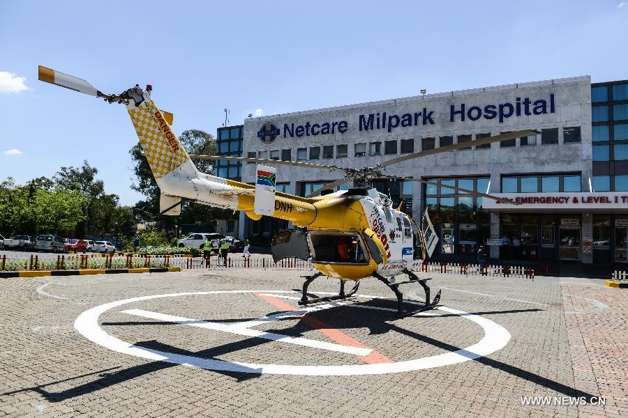 An injured woman is transferred by helicopter to the Milpark Hospital in Johannesburg, South Africa, on Oct 2, 2014. At least three Chinese tourists were killed and an unidentified number of others injured when their bus collided with a van near Johannesburg on Wednesday, the Chinese Embassy in South Africa confirmed. (Xinhua/Zhai Jianlan)