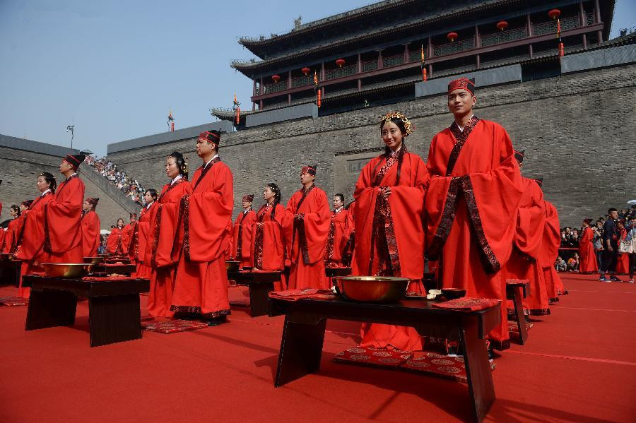 New couples attend a group wedding ceremony inside the south gate of Xi'an City wall in Xi'an, capital of northwest China's Shaanxi Province, Oct. 3, 2014. Wearing traditional Han costume, a total of 102 couples held the Chinese-style group wedding here on Friday. (Xinhua/Liu Xiao)