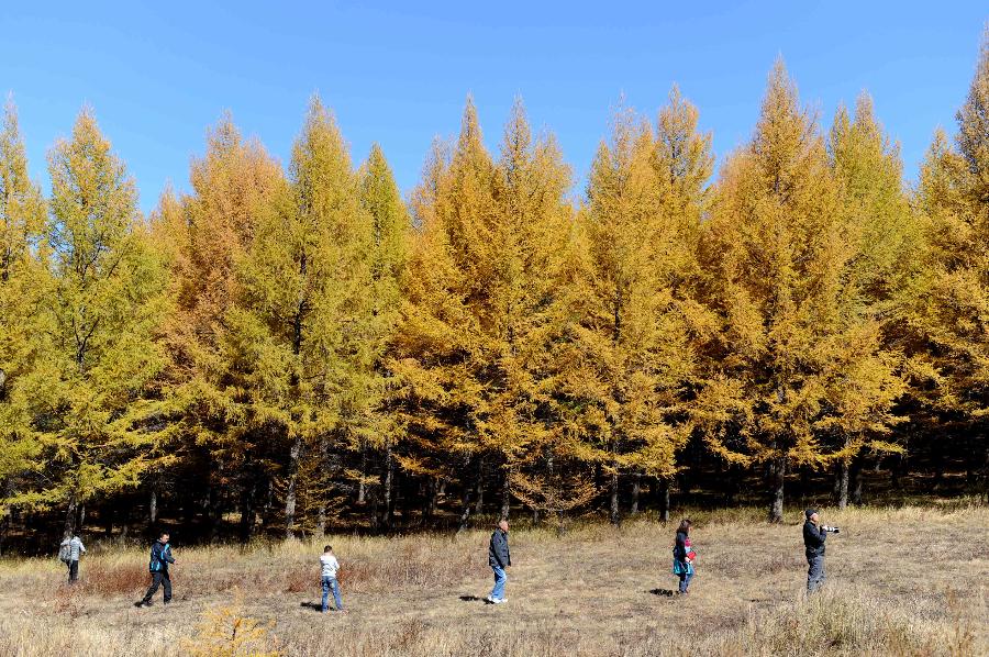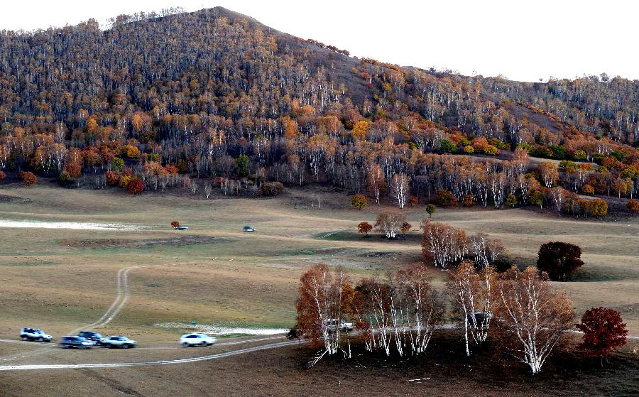 Self-driving tourists pass on a grassland in Hexigten Banner of Chifeng City, north China's Inner Mongolia Autonomous Region, Oct. 3, 2014. The autumn scenery of Inner Mongolia attracted many people during the seven-day National Day holiday. (Xinhua/Zhang Ling)