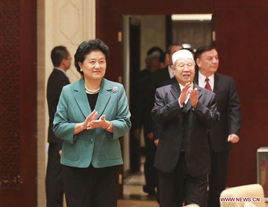 Chinese Vice Premier Liu Yandong (3rd L), E'uigen Iminbaha (5th L), vice-chairman of China's National People's Congress Standing Committee, Ling Jihua (2nd L), vice chairman of the National Committee of the Chinese People's Political Consultative Conference (CPPCC), Wang Zhengwei (6th L), vice chairman of the CPPCC National Committee, and Ma Biao (1st L), also vice chairman of the CPPCC National Committee, attend the reception held by the Islamic Association of China (IAC) to celebrate Corban Festival, or Eid al-Adha, in Beijing, capital of China, Oct. 4, 2014. (Xinhua/Ding Lin)