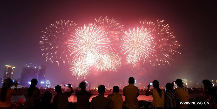 People watch the fireworks at a music fireworks gala celebrating the National Day by the riverside of Xiangjiang River in Changsha, capital of central China's Hunan Province, Oct. 4, 2014. (Xinhua/Long Hongtao)