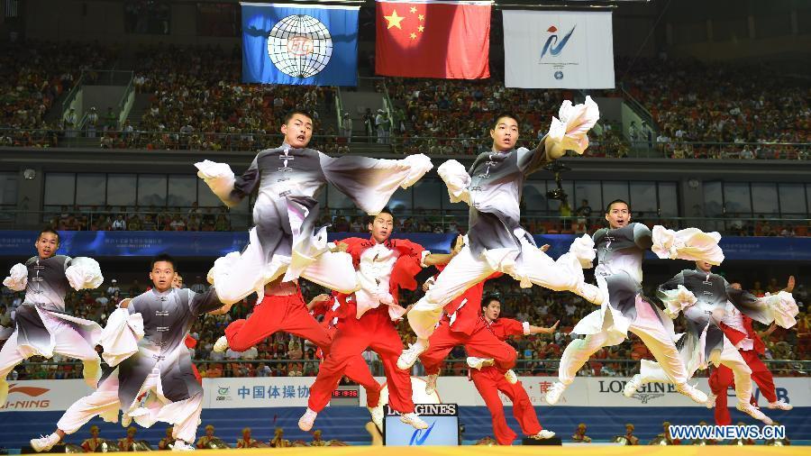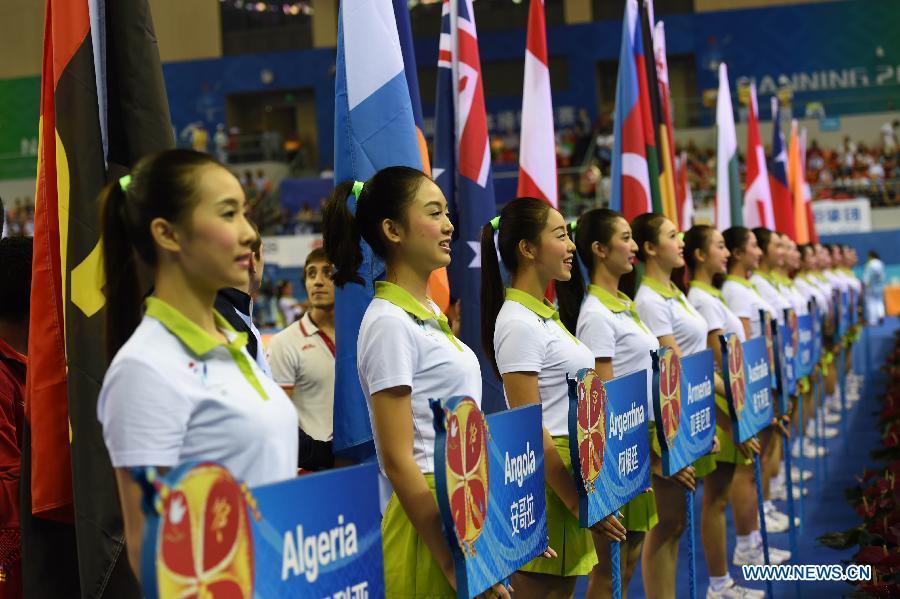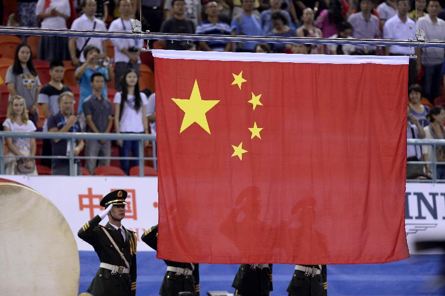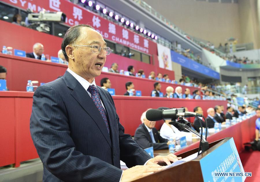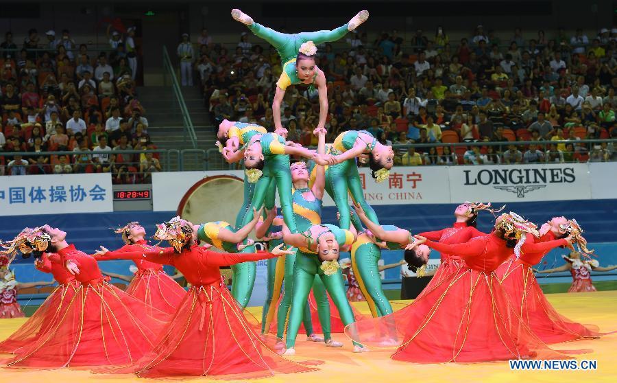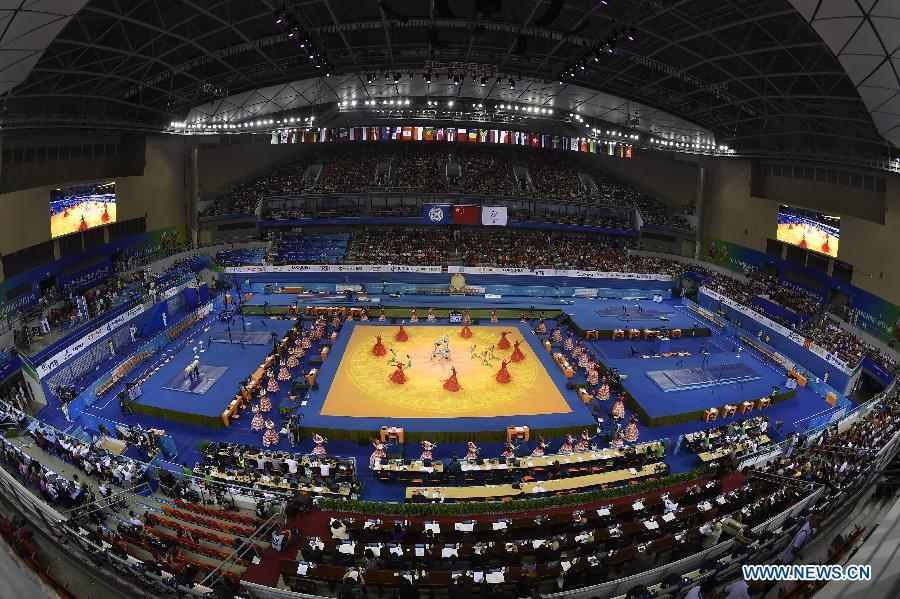 Volunteers are see on the opening of the finals of the 45th Gymnastics World Championships in Nanning, capital of south China's Guangxi Zhuang Autonomous Region, Oct 7, 2014. The finals of the 45th FIG Artistic Gymnastics World Championships started Tuesday in Nanning. (Xinhua/Yang Zongyou)