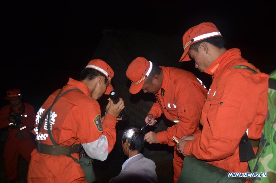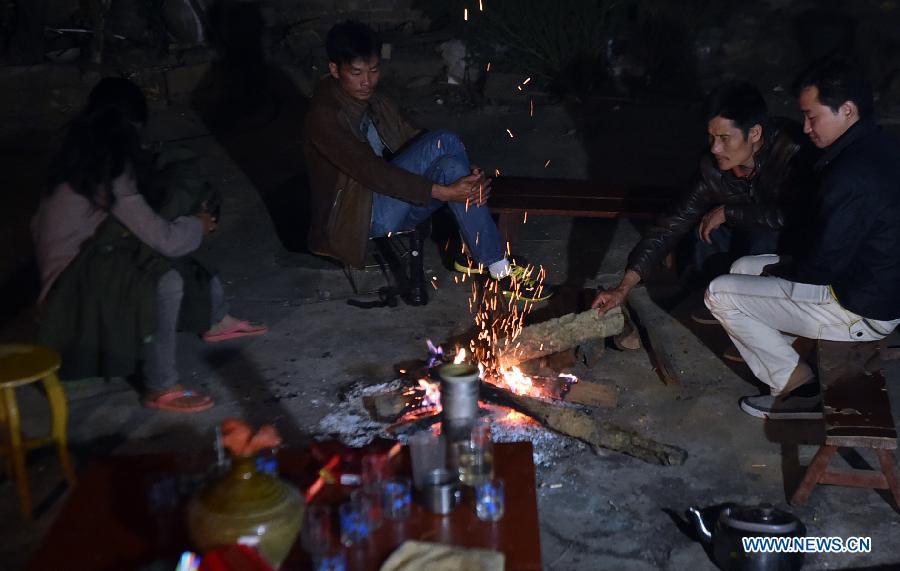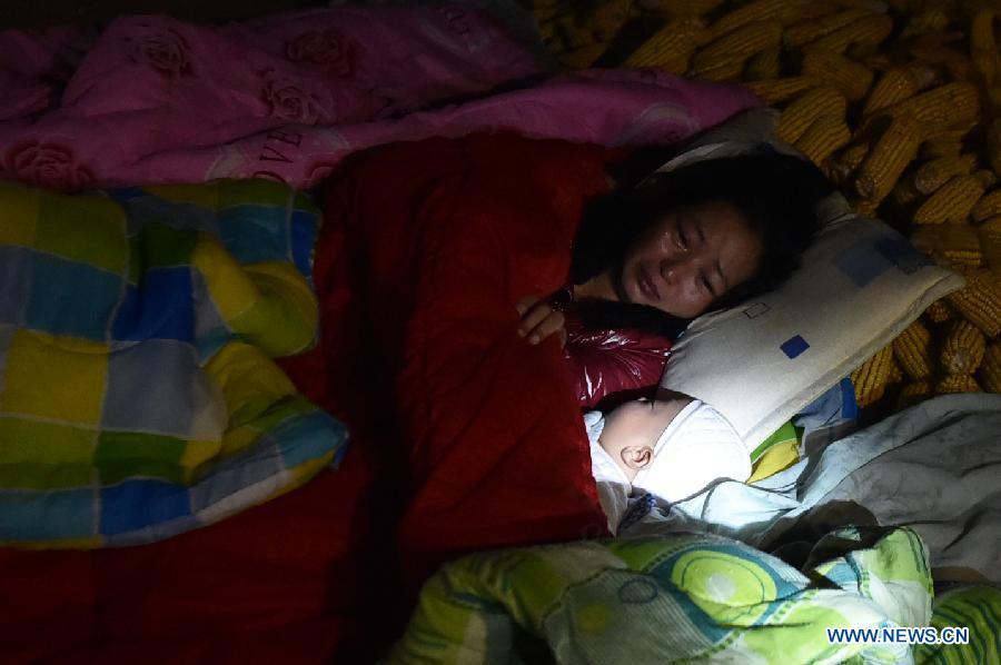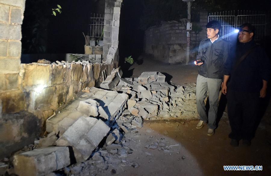 Villagers check the damaged house at Mangla Village of Yongping Township at Jinggu County of Pu'er City, southwest China's Yunnan province, Oct 8, 2014. One person died and 324 others were injured after a 6.6-magnitude quake jolted Yunnan province Tuesday night, according to local government. (Xinhua/Chen Haining)