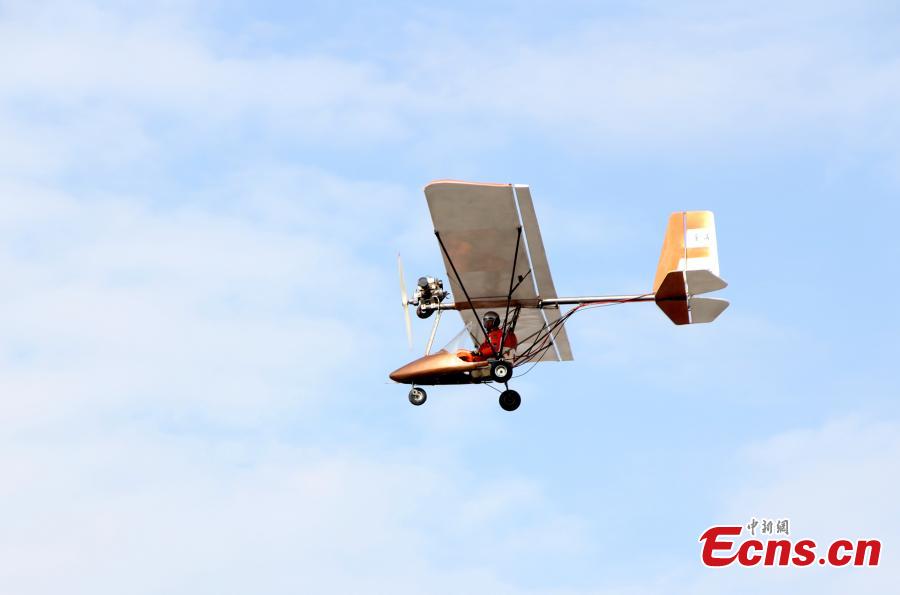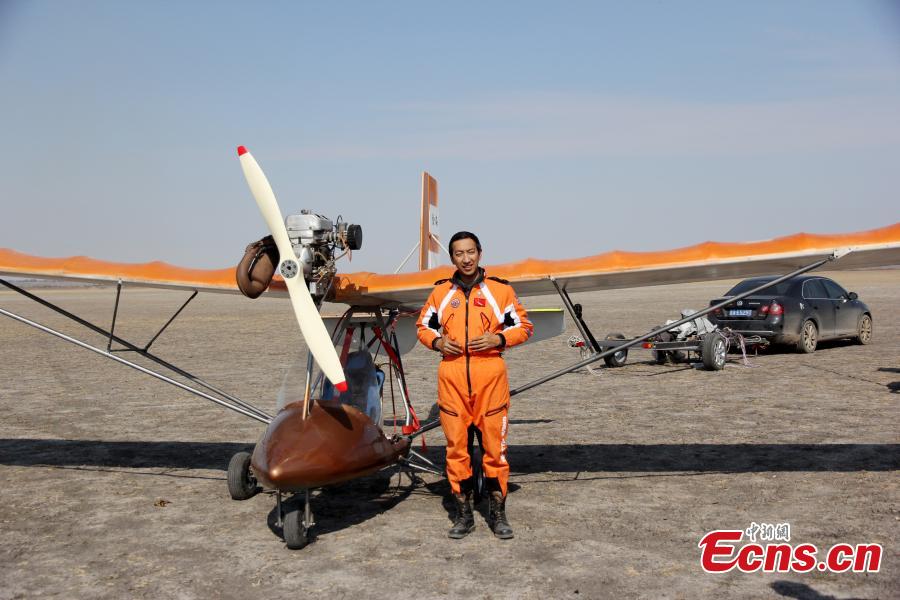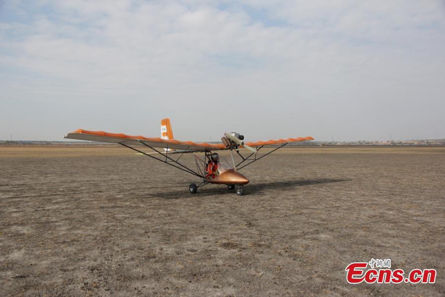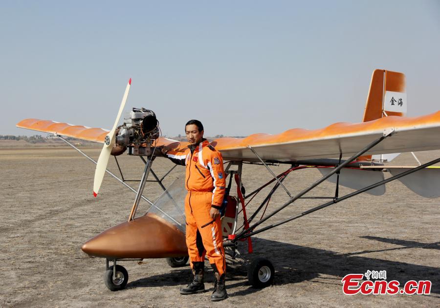 Yang Shijun, a resident of Changchun, Jilin province stands in front of an aircraft he made by himself in Changchun. Yang built the plane in memory of his late father who had been a pilot for 29 years. [Photo: China News Service/ Zhang Yao]