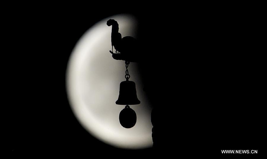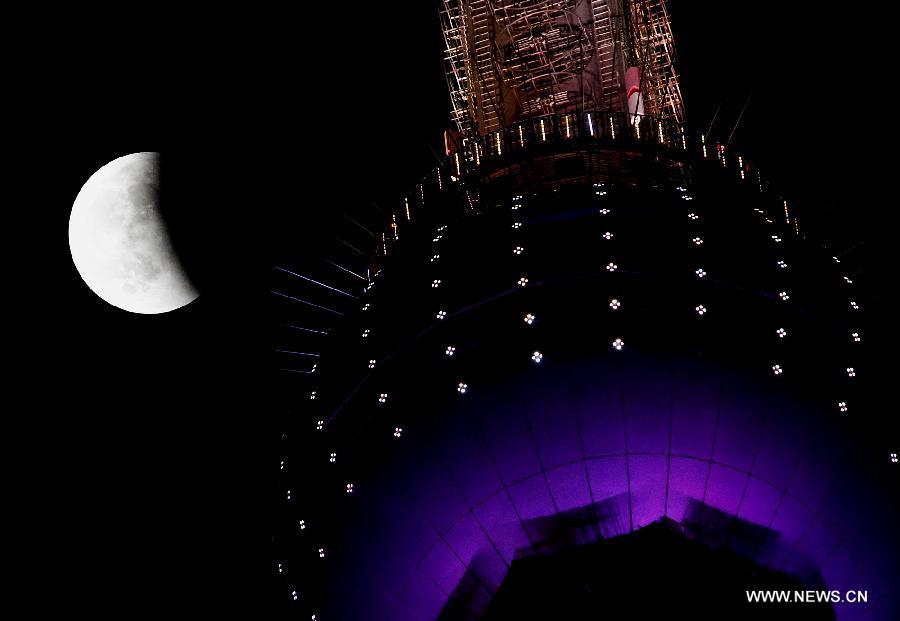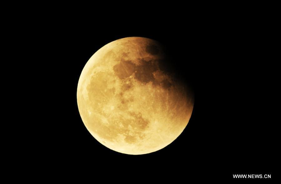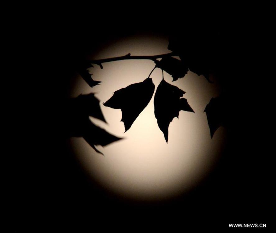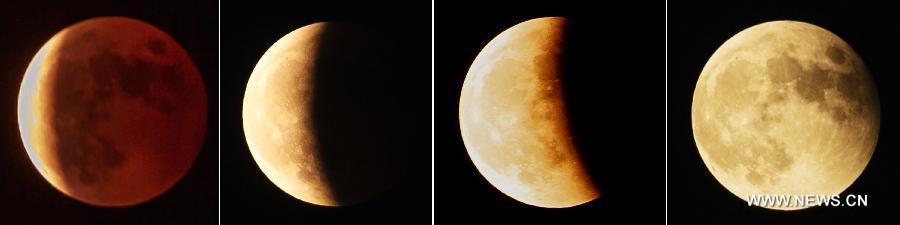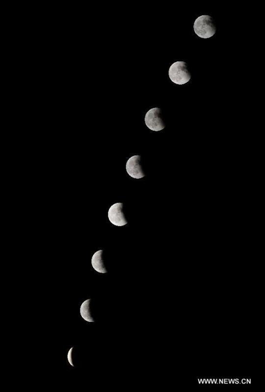 The photo taken on Oct 8, 2014 using multiple exposure shows the moon in the sky during a total lunar eclipse in east China's Shanghai. A total lunar eclipse is sometimes called a blood moon because of the red color that is cast upon it by light refracting in Earth's atmosphere. (Xinhua/Chen Fei)