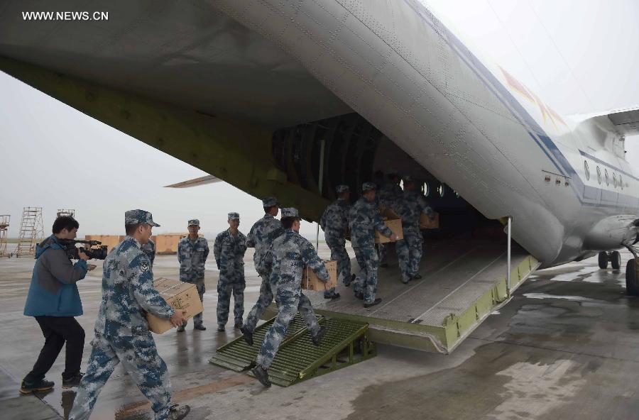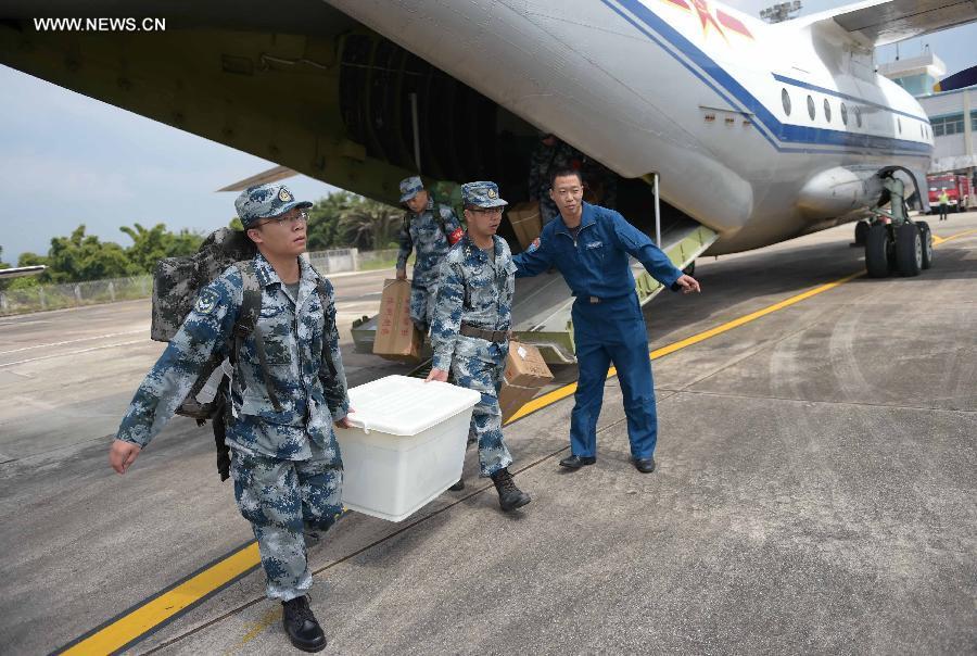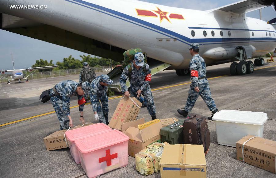Soldiers carry medical supplies for quake-hit areas at the Simao Airport in southwest China's Yunnan province, Oct 8, 2014. Medical staff and supplies from Chengdu Air Force have arrived at the Jinggu County on Wednesday. A 6.6-magnitude quake jolted Yunnan province Tuesday night. (Xinhua/Xue Yubin)