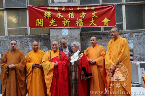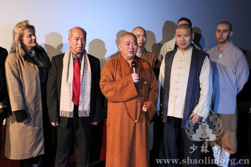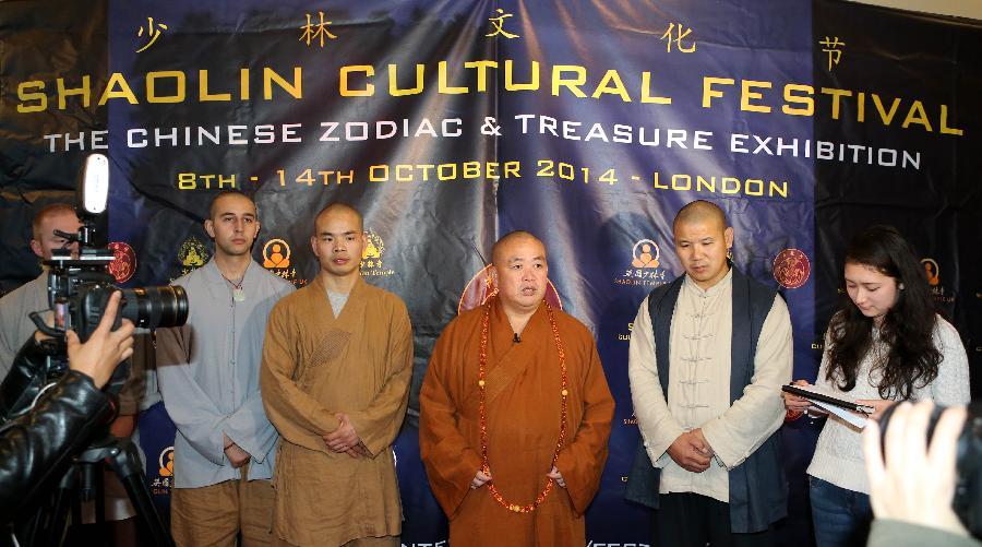 Shi Yongxin (3rd R), the abbot of China's Shaolin Temple, attends a press conference for the 3rd Shaolin Cultural Festival in London, Britain, on Oct 8, 2014. The third Shaolin Cultural Festival will be held in London from Oct 8 to 14. (Xinhua/Han Yan)