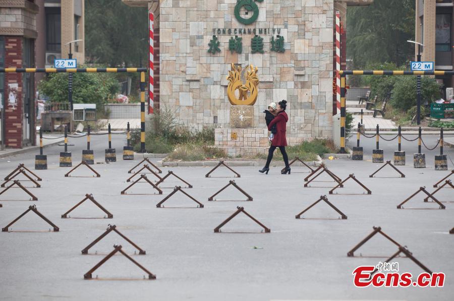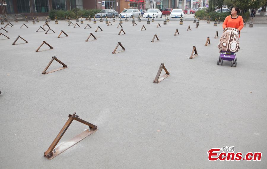 Several parking locks are seen installed on a small square of a residential community in Changchun, Jilin province on October 9, 2014. These locks were installed by property management office of the community to deter people from dancing on the square. [Photo: China News Service/ Zhang Yao]