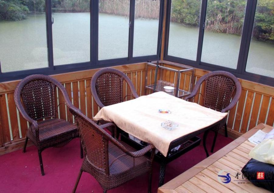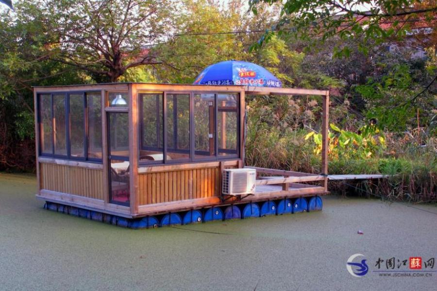 A small glass house is seen floating on river in Nantong, Jiangsu province. Zhang Yulin, the 54-year-old owner of the floating home said the structure was made by him and his brothers and sisters to please their mother who was over 70 years old. The 30-square-meter leisure room was built with actinic glass, wood, and plastic buckets. The room was installed with lighting and even an air conditioner. [Photo/ jschina.com.cn]