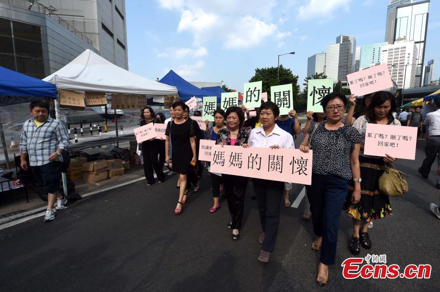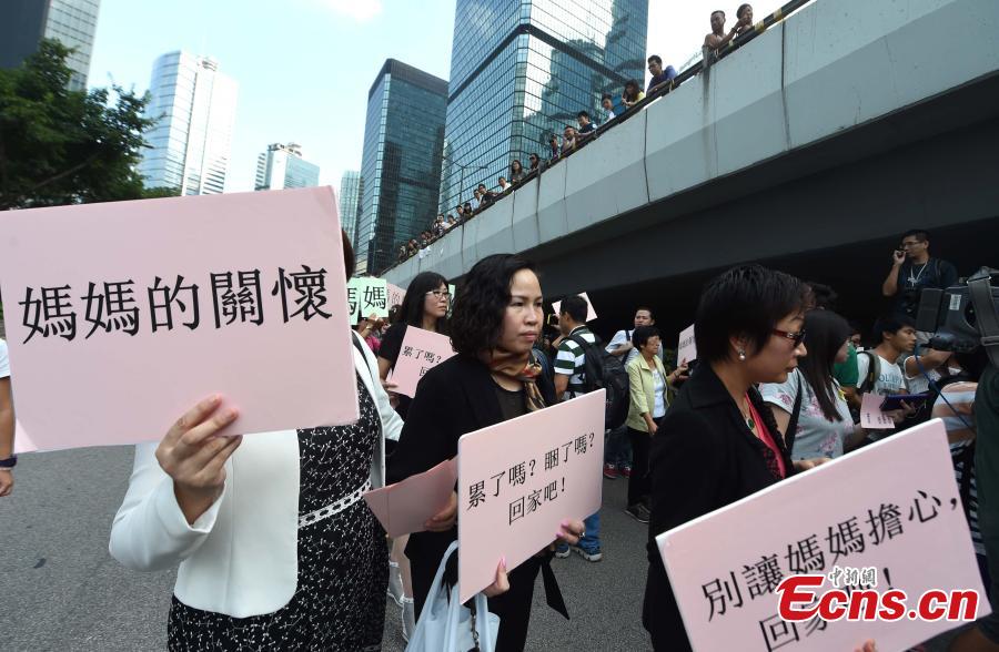 More than 30 mothers launch a campaign at a protest site in Hong Kong on Friday, October 10, 2014, trying to persuade students to put an end to the Occupy Central movement. The movement entered its 13th day on Friday. [Photo: China News Service/Zhang Yu]