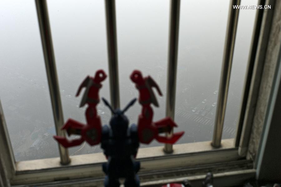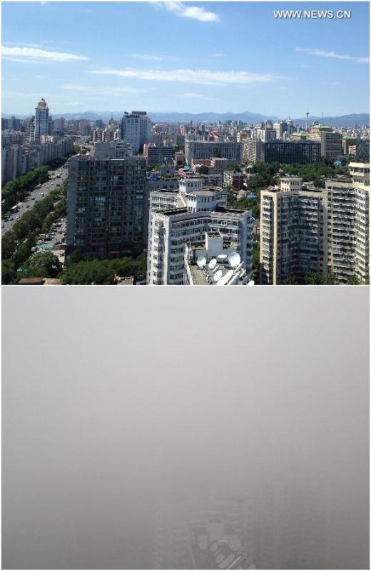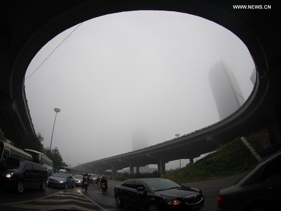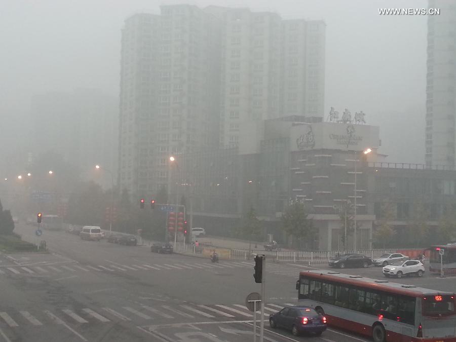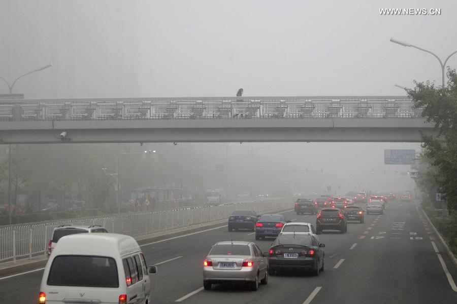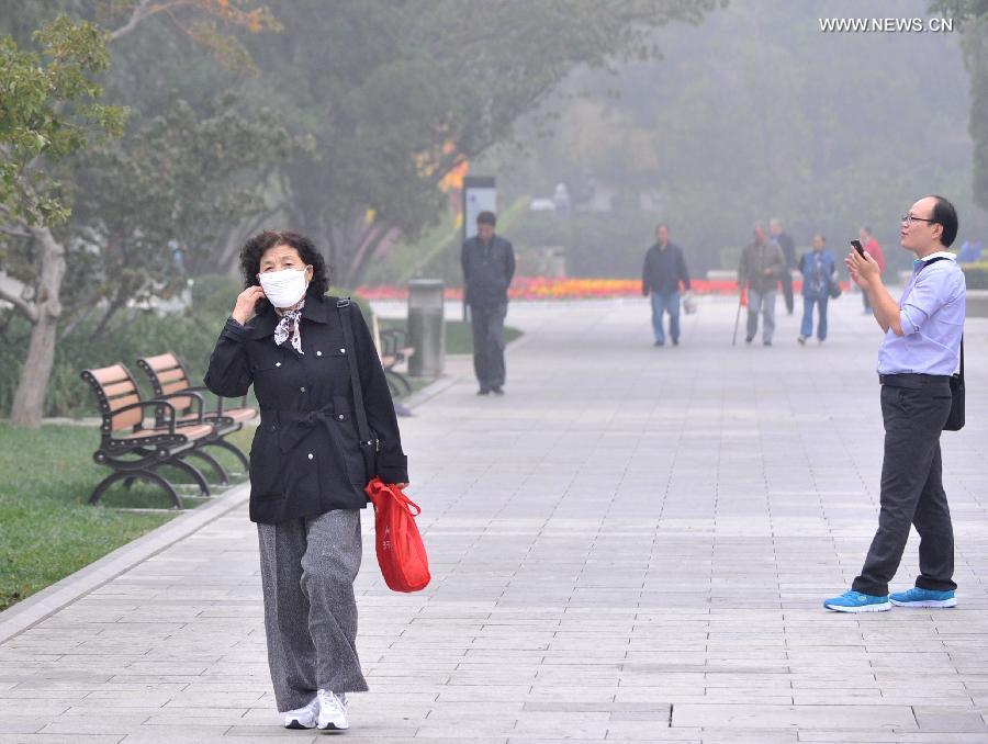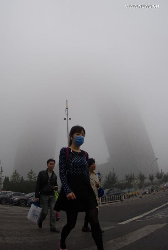 A woman wearing a mask walks on a smog-shrouded road in Beijing, capital of China, Oct. 11, 2014. (Xinhua/Luo Xiaoguang)