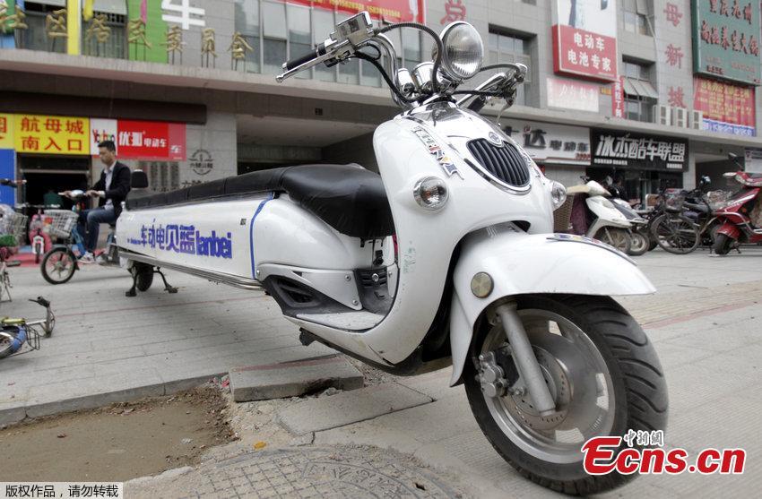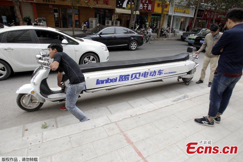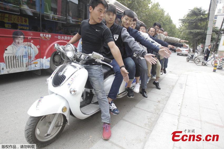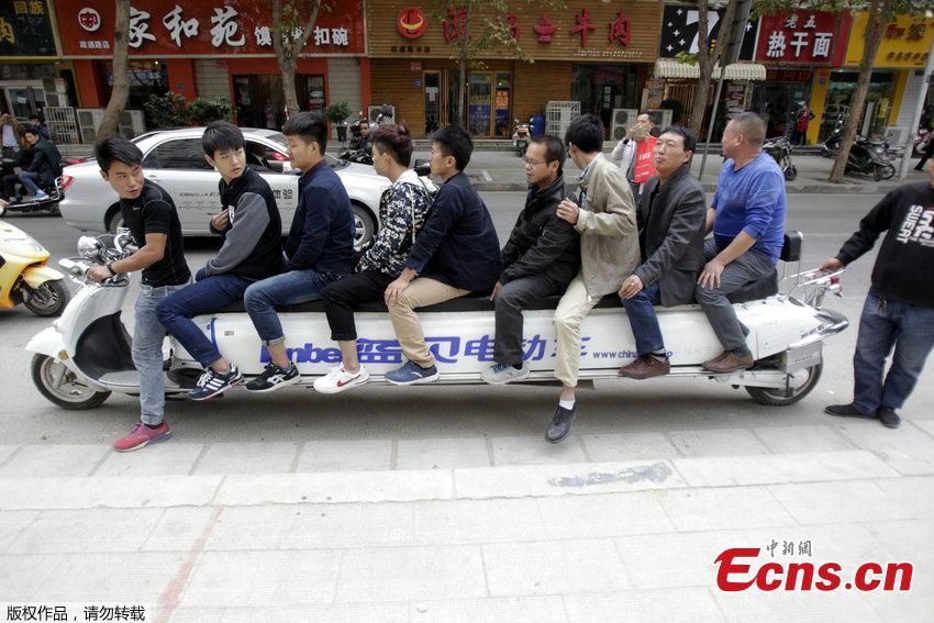 A total of nine men sit on a long electric bicycle in Zhengzhou, Central China’s Henan province on Sunday, October 12, 2014. The 4.7-meter-long unique bike was shown as an exhibit by a shop to attract customers. Owner of the bike said he bought it from a Zhejiang-based producer, and the manufacturer hoped the product could break the Guinness World Record of “the longest electric bike.” [Photo/ CFP]