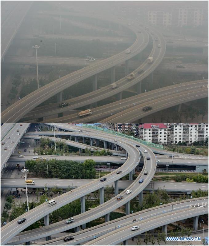 Combination photo taken on Oct 9, 2014 (upper) and Oct 13, 2014 (lower) shows a sharp contrast of the urban area of Shijiazhuang, capital of north China's Hebei province, during and after the smoggy days. A heavy wind coming with a cold front on Oct 12 blew away fog and smog which lingered in the city for several days. (Xinhua/Mo Yu)