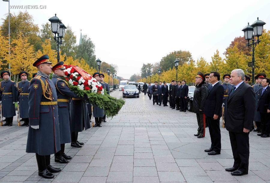 Chinese Premier Li Keqiang (R, front) lays a wreath to the Tomb of the Unknown Soldier in Moscow, capital of Russia, Oct 13, 2014. (Xinhua/Rao Aimin)