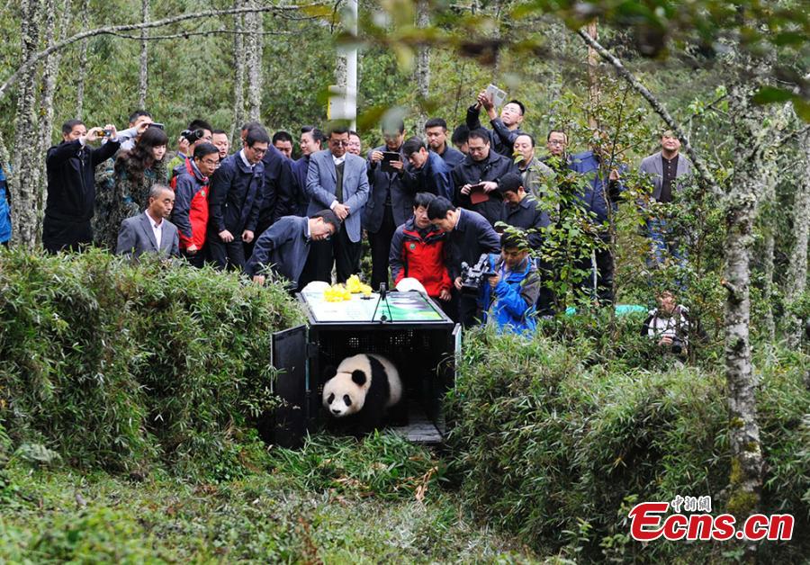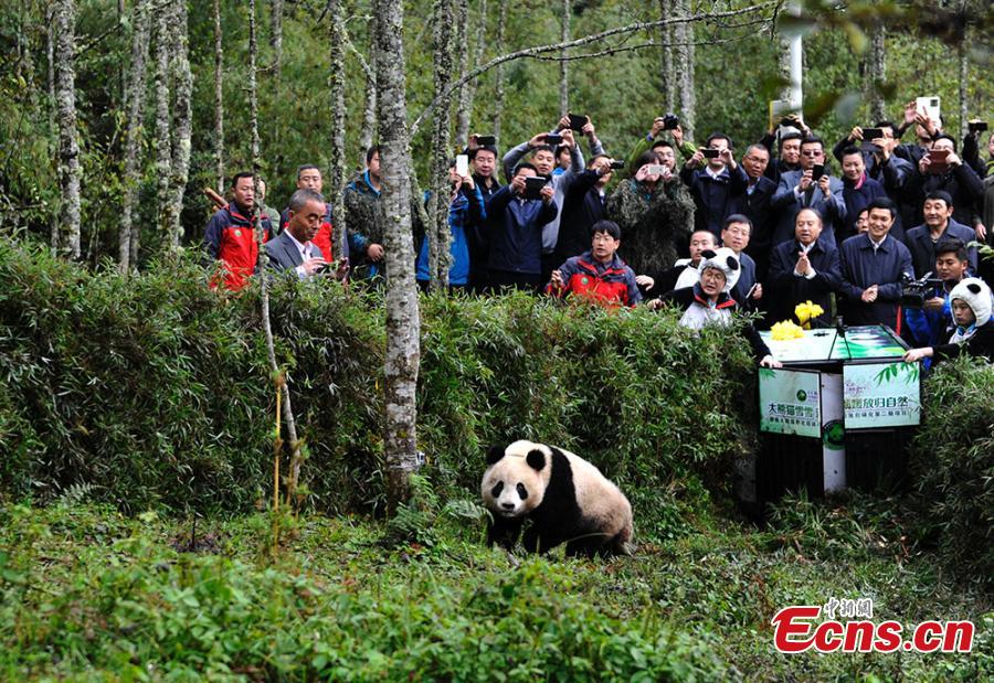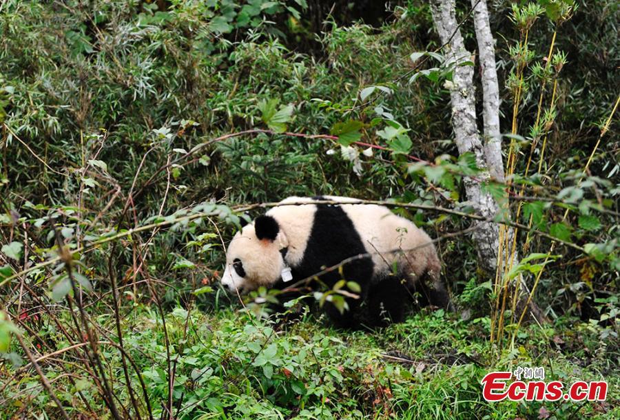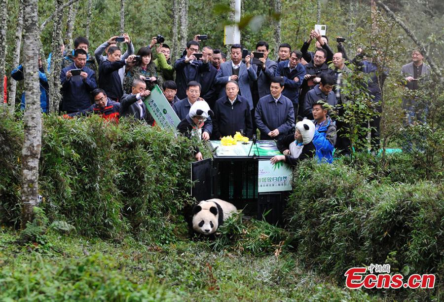 Female panda Xue Xue takes her first steps into the wild at Liziping Nature Reserve in Sichuan province on Tuesday, October 14, 2014. The 2-year-old panda was lured out by staff members of the reserve who dressed in panda costumes. [Photo/ An Yuan]