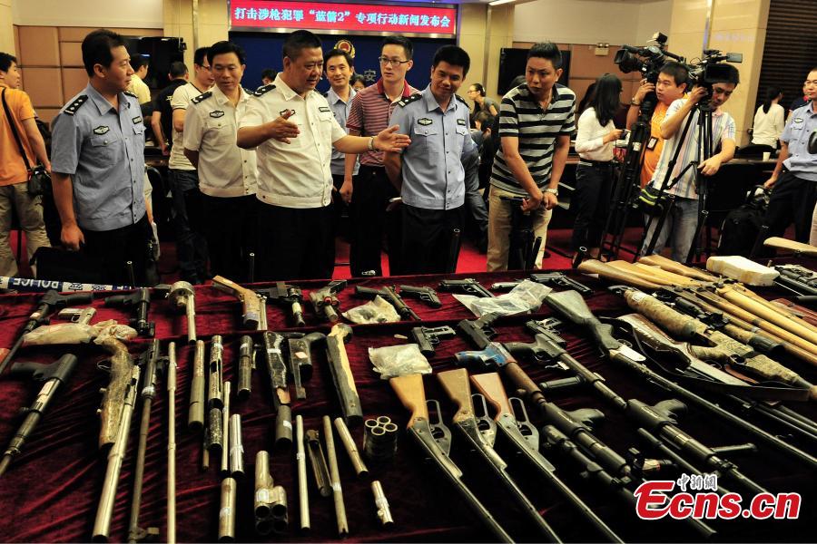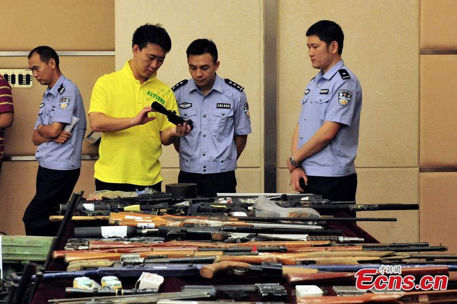 Police officers show seized guns in Guangdong Provincial Public Security Department in Guangzhou on Tuesday, October 14, 2014. A total of 222 guns and 42,729 gun parts were seized in a crackdown targeting gun-related crimes launched in 29 provinces and regions across the country. [Photo: China News Service/ Chen Jimin]