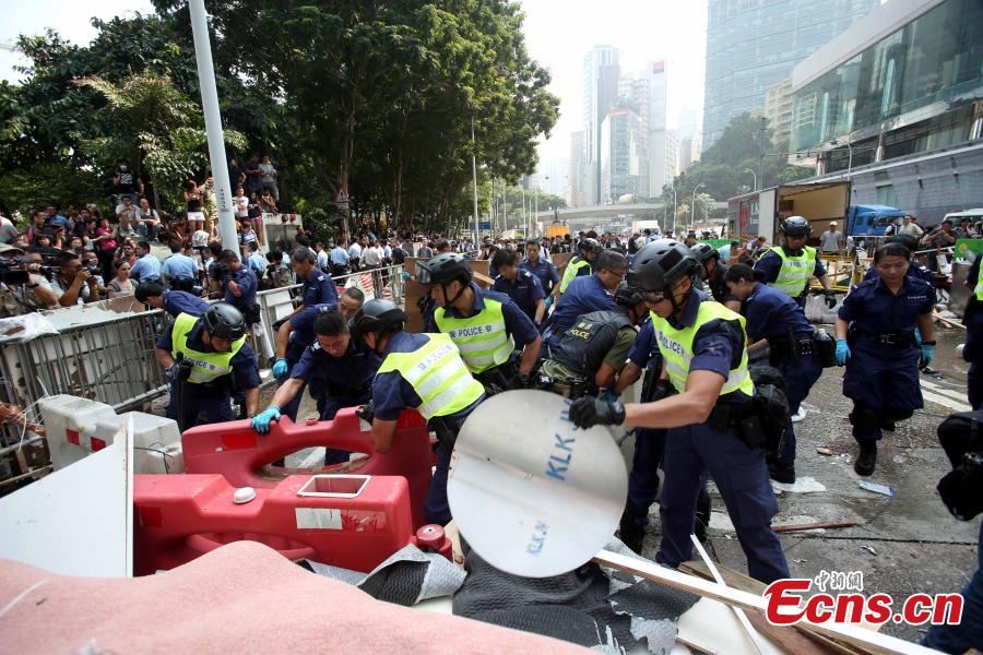 Hong Kong police remove blockades erected by Occupy Central students on a lane in Admiralty, the city's business district on Tuesday morning, October 14, 2014. Hundreds of police, some carrying chainsaws, participated in the action. The police say they plan to reopen both tram lanes. The movement entered its 17th day on Tuesday. [Photo: China News Service/ Hong Shaokui]