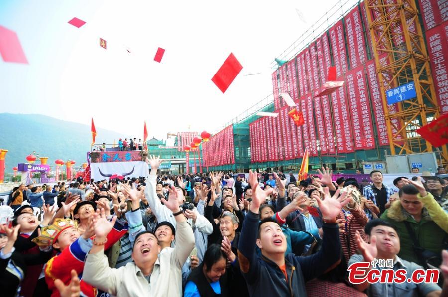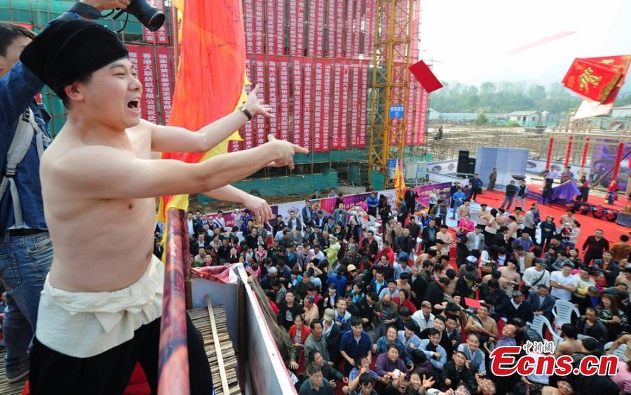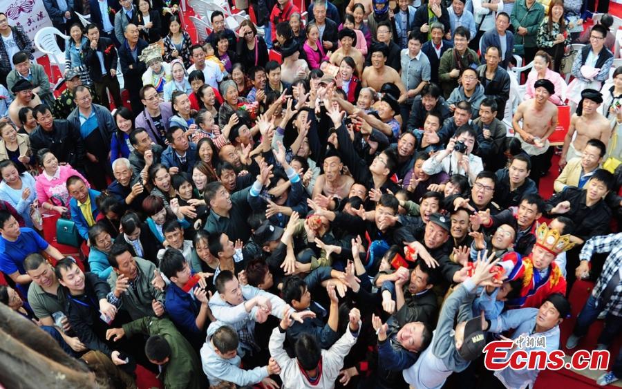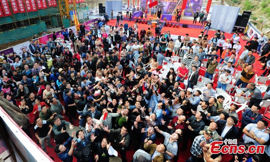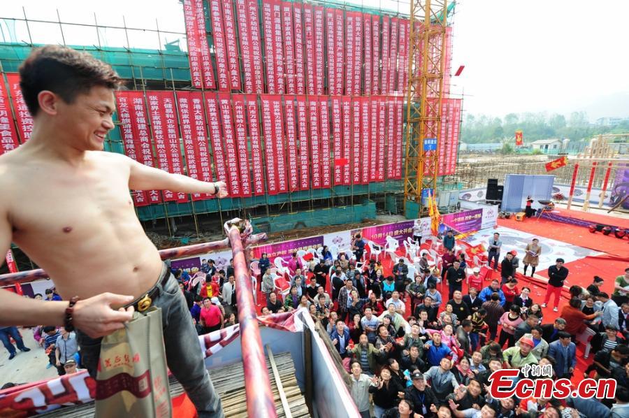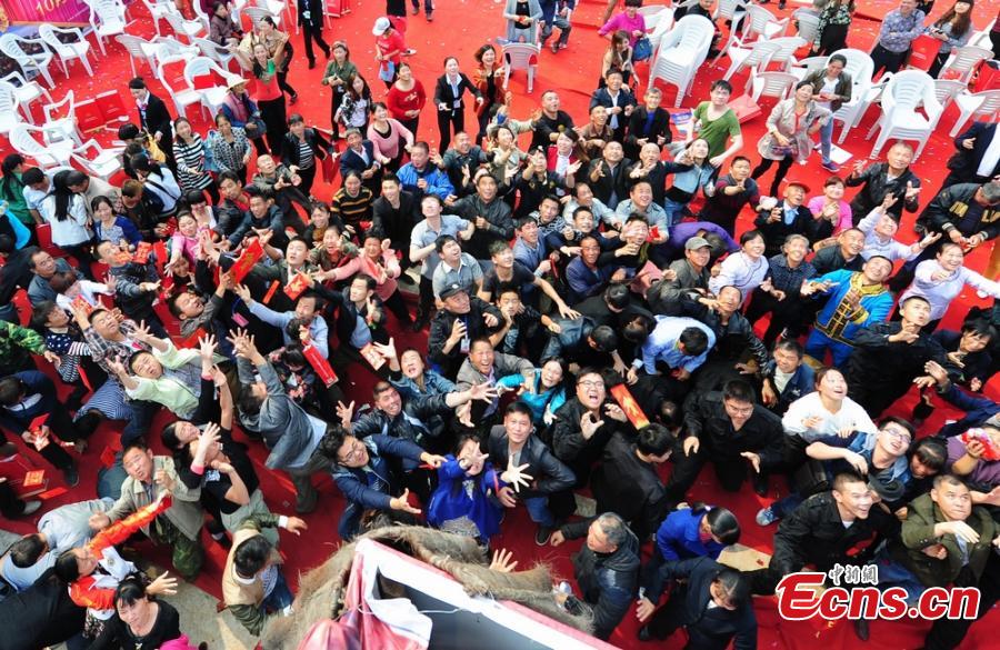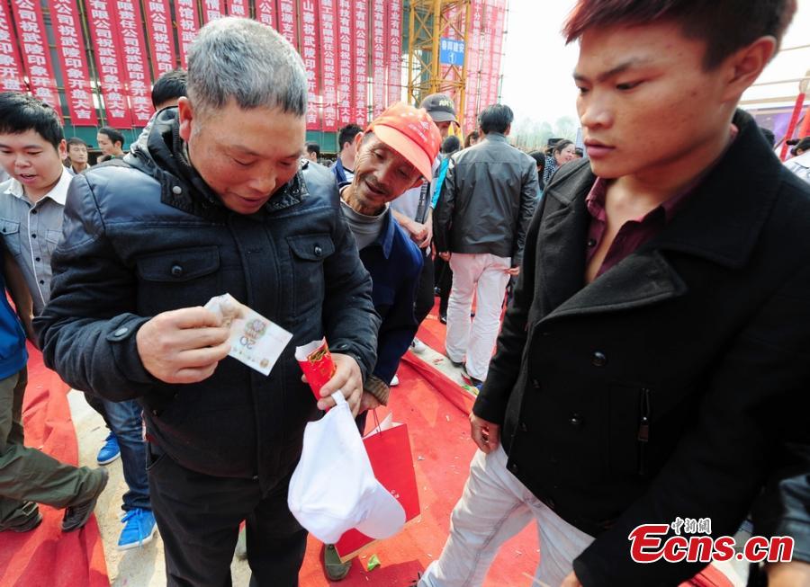 A boss of a real estate firm throws envelopes of cash totalling 50,000 yuan ($8,161) to crowds from the top of a building in Hunan province on Oct 14, 2014. The firm pulled the publicity stunt to attract clients. [Photo/Yang Huafeng]
