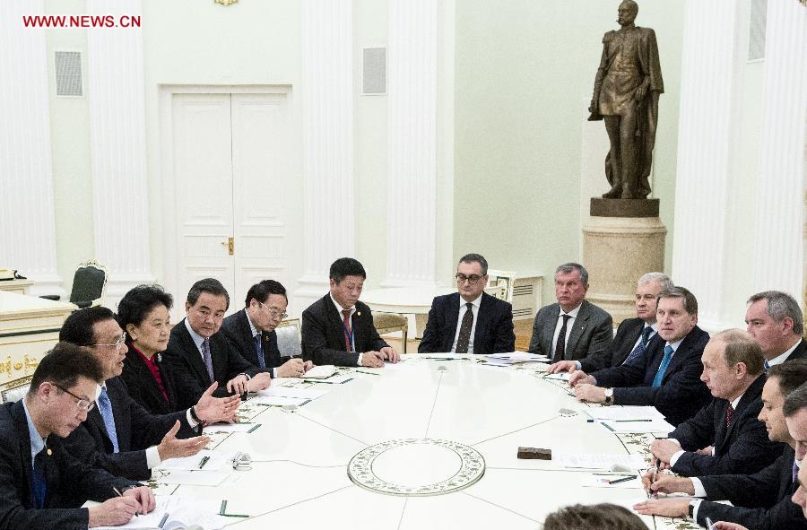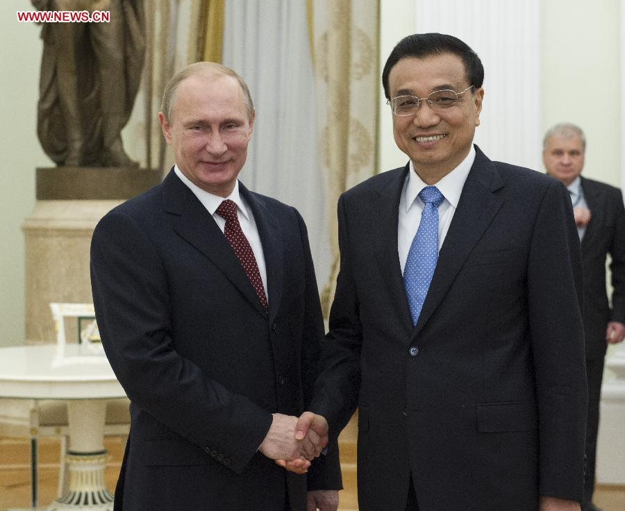 Chinese Premier Li Keqiang(R) meets with Russian President Vladimir Putin in Moscow, capital of Russia, Oct 14, 2014. (Xinhua/Rao Aimin)